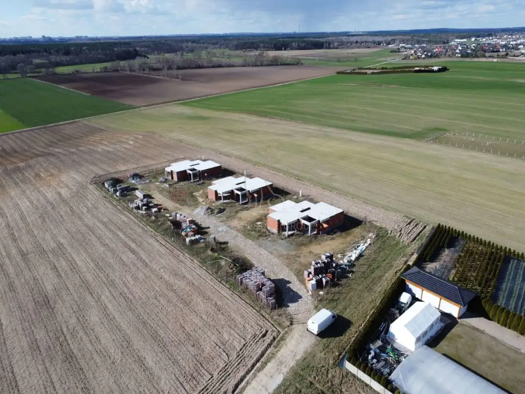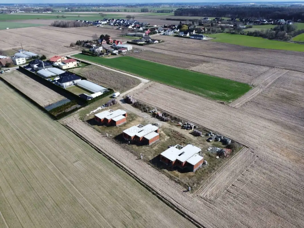 Teren na zewnątrz budynków ogrodzony z 3 stron płotem panelowym (oprócz strony frontowej), podjazdy, ścieżki i taras wyłożony z kostki brukowej.