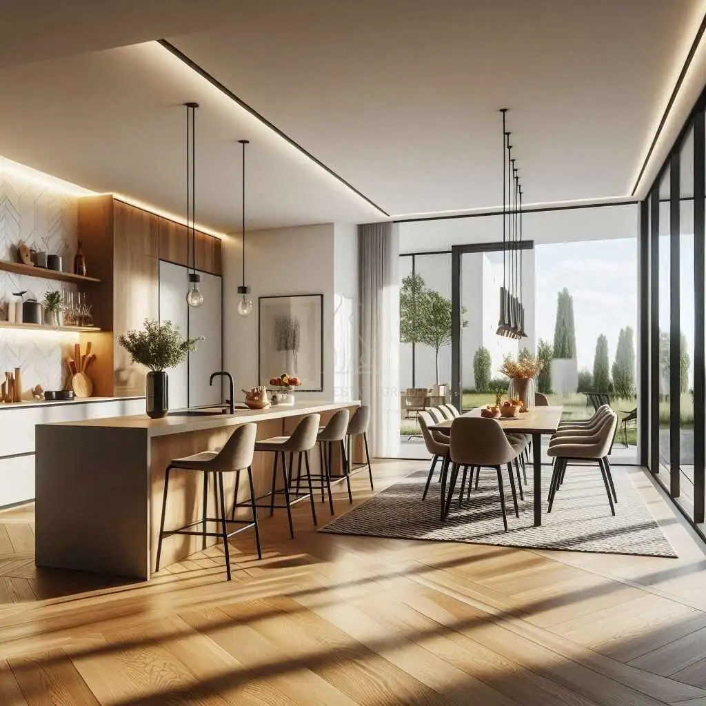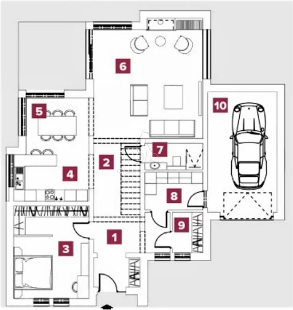 Parter: wyjątkowa strefa dzienna, wyposażona w liczne przeszklenia z wyjściem na ogród, otwarta kuchnia płynnie połączona z jadalnią o łącznej powierzchni prawe 55 m², dodatkowa sypialnia, garderoba i łazienka, a także wiatrołap prowadzący do garażu oraz pomieszczenia gospodarczego.