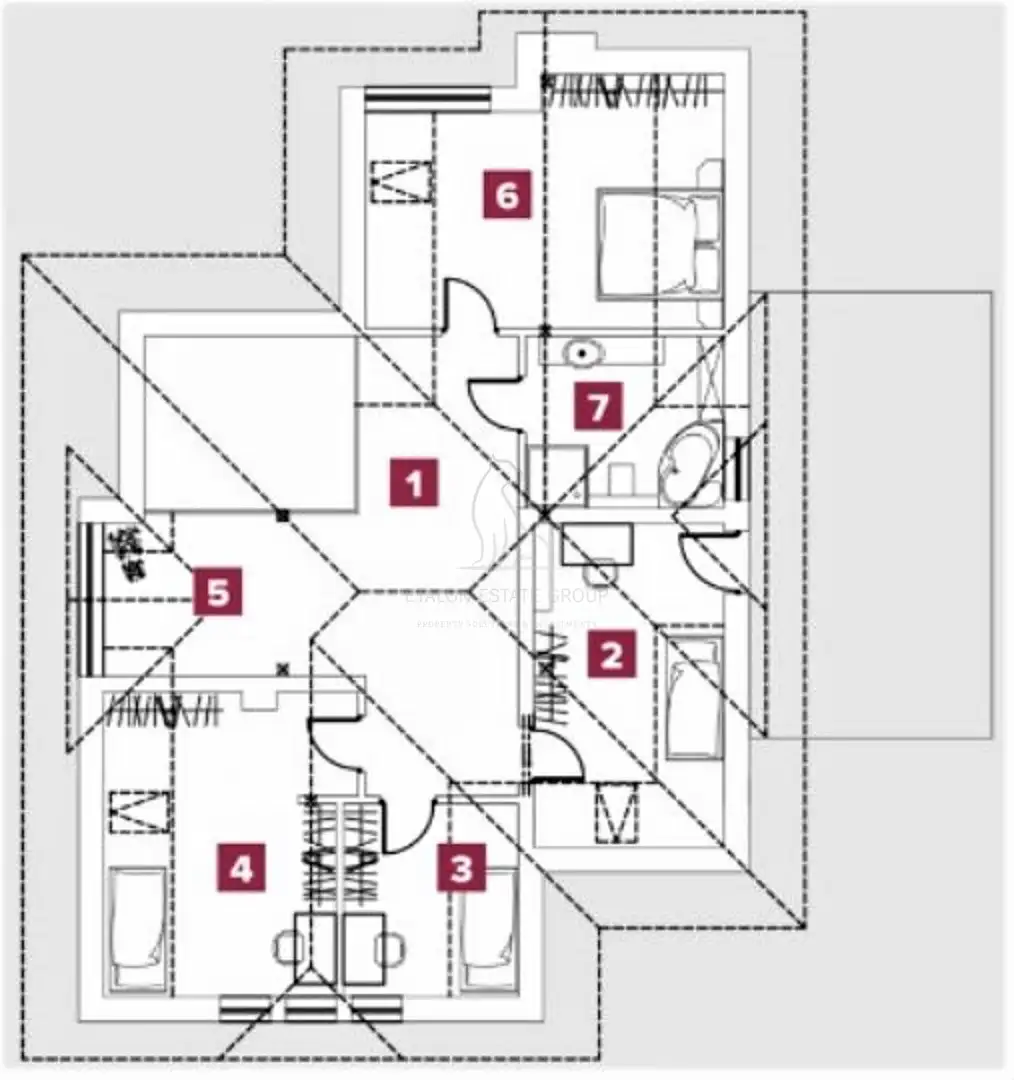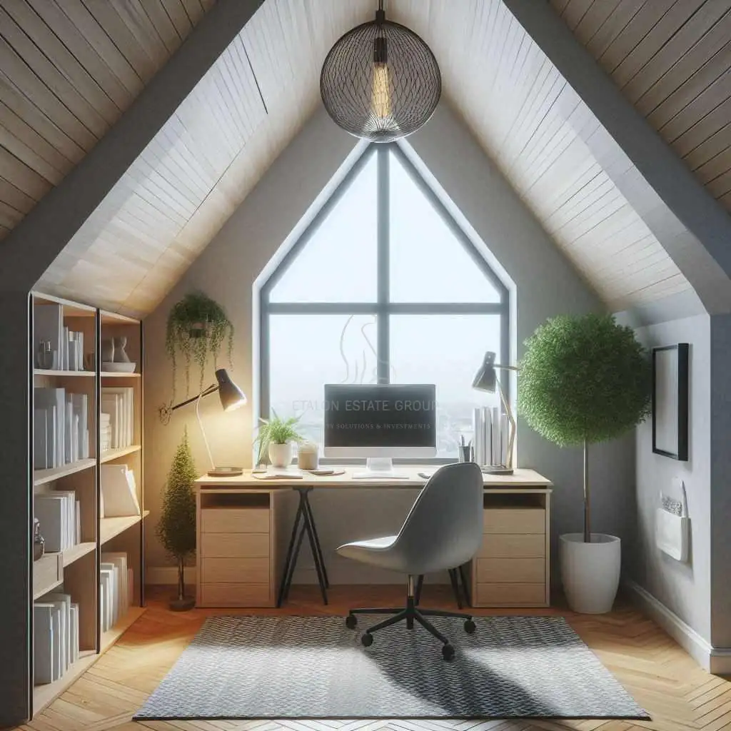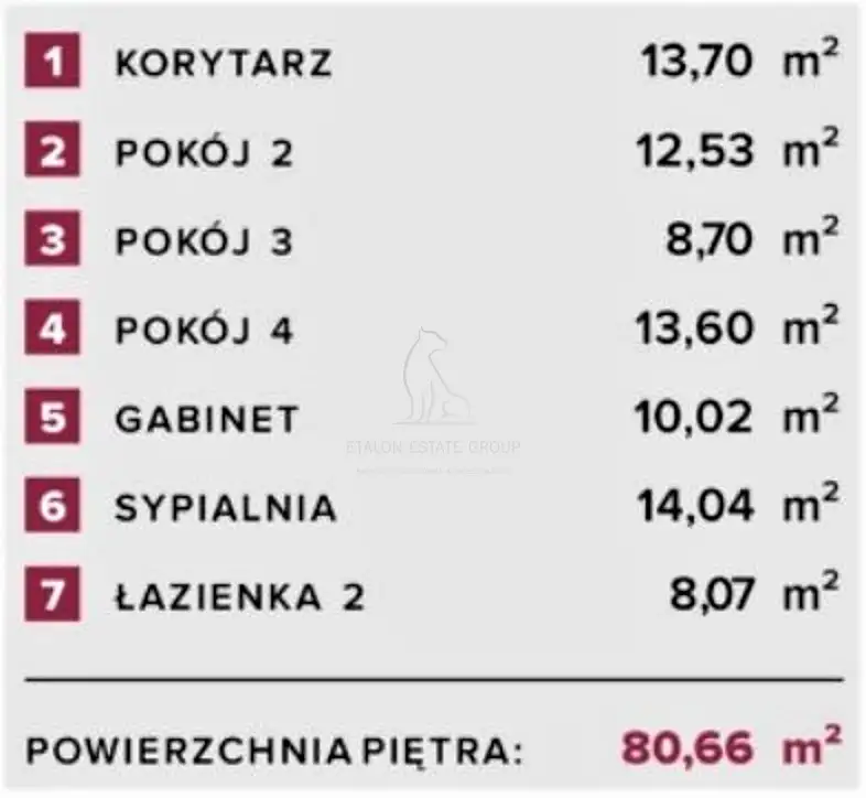 Piętro: 4 ustawne sypialnie, łazienka oraz otwarta przestrzeń na gabinet.