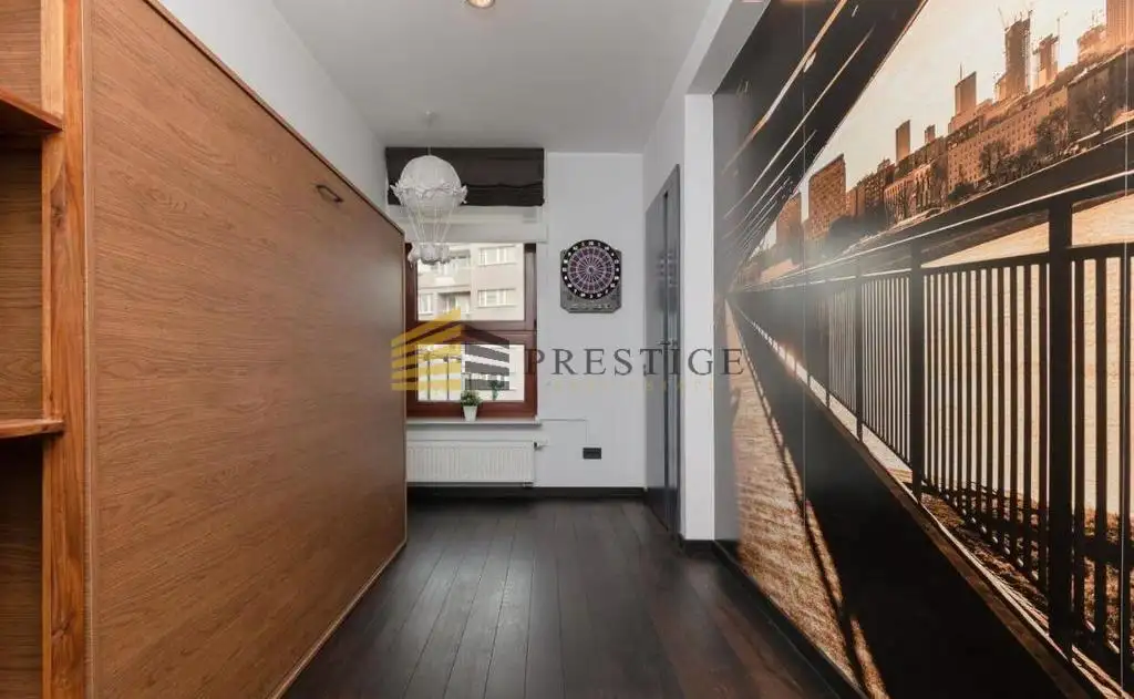 To the left of the hall are two bedrooms, and to the right is the bathroom. The hall leads to a bright living room with panoramic windows, which adjoins a third bedroom (which could be used as a study). The living room and two bedrooms offer beautiful panoramic views of Powiśle and the National Stadium.