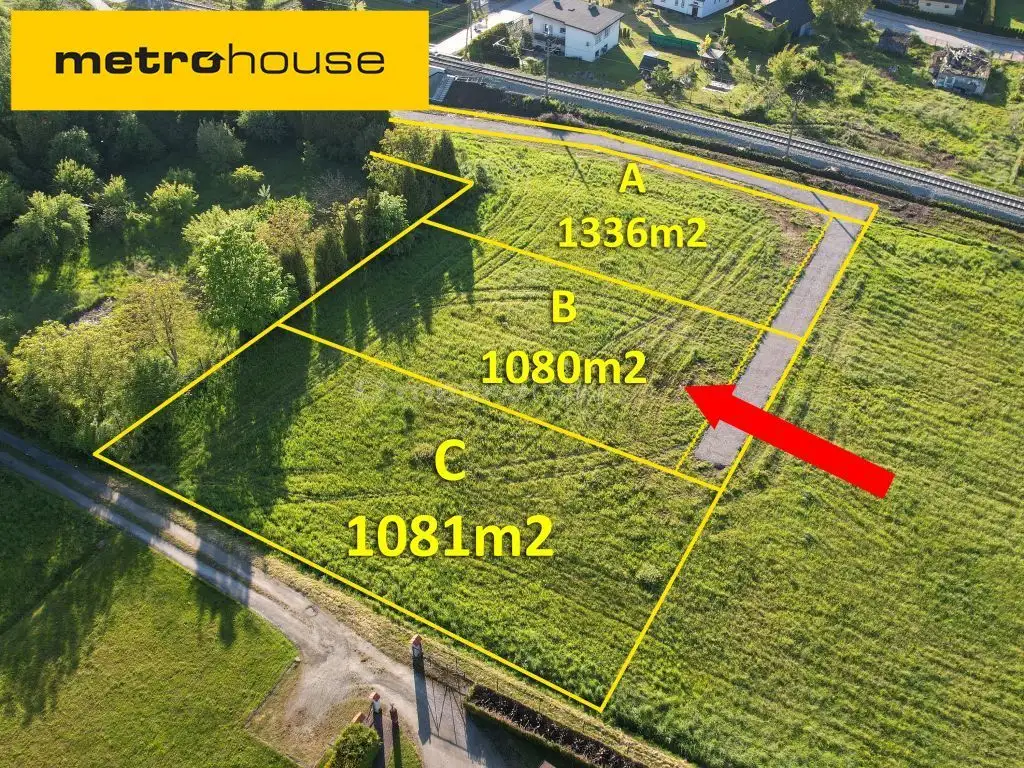 Piękna, budowlana działka w Kozach o powierzchni 1081m² na zdjęciu zaznaczona jako 'B'.
