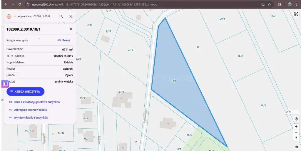 Teren o powierzchni 6711 m², w kształcie trójkąta, z wydanymi warunkami zabudowy, pozwala na zabudowanie 760 m² powierzchni działki.