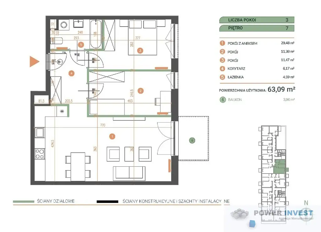 Mieszkanie znajduje się na najwyższym 7 piętrze. Lokal ma powierzchnię 63,09 m² i składa się z: