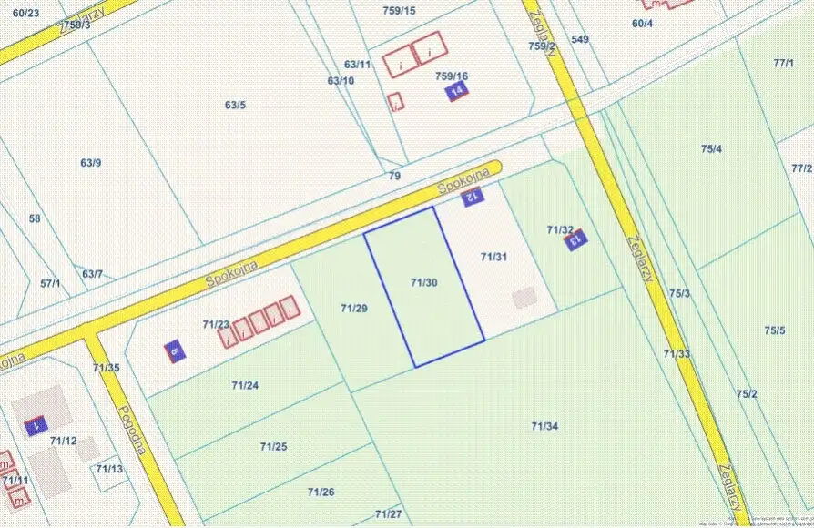 Działka o kształcie regularnym zbliżonym do prostokąta, nieogrodzona, porośnięta drzewami i krzewami. Przez teren nieruchomości przebiega napowietrzna infrastruktura elektroenergetyczna. Działka posiada dostęp do drogi gminnej ul. Spokojnej (o nawierzchni gruntowej) działki nr 71/35. Wjazd na działkę nie jest urządzony.