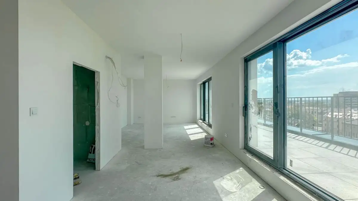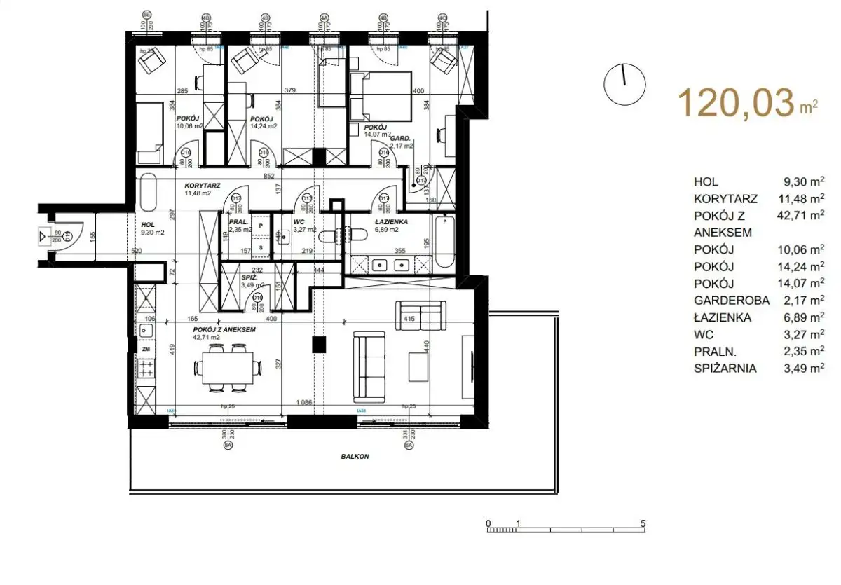 -Pokój dzienny z aneksem kuchennym o pow. 42,71 m² z wyjściem na balkon o pow. około 30 m²,