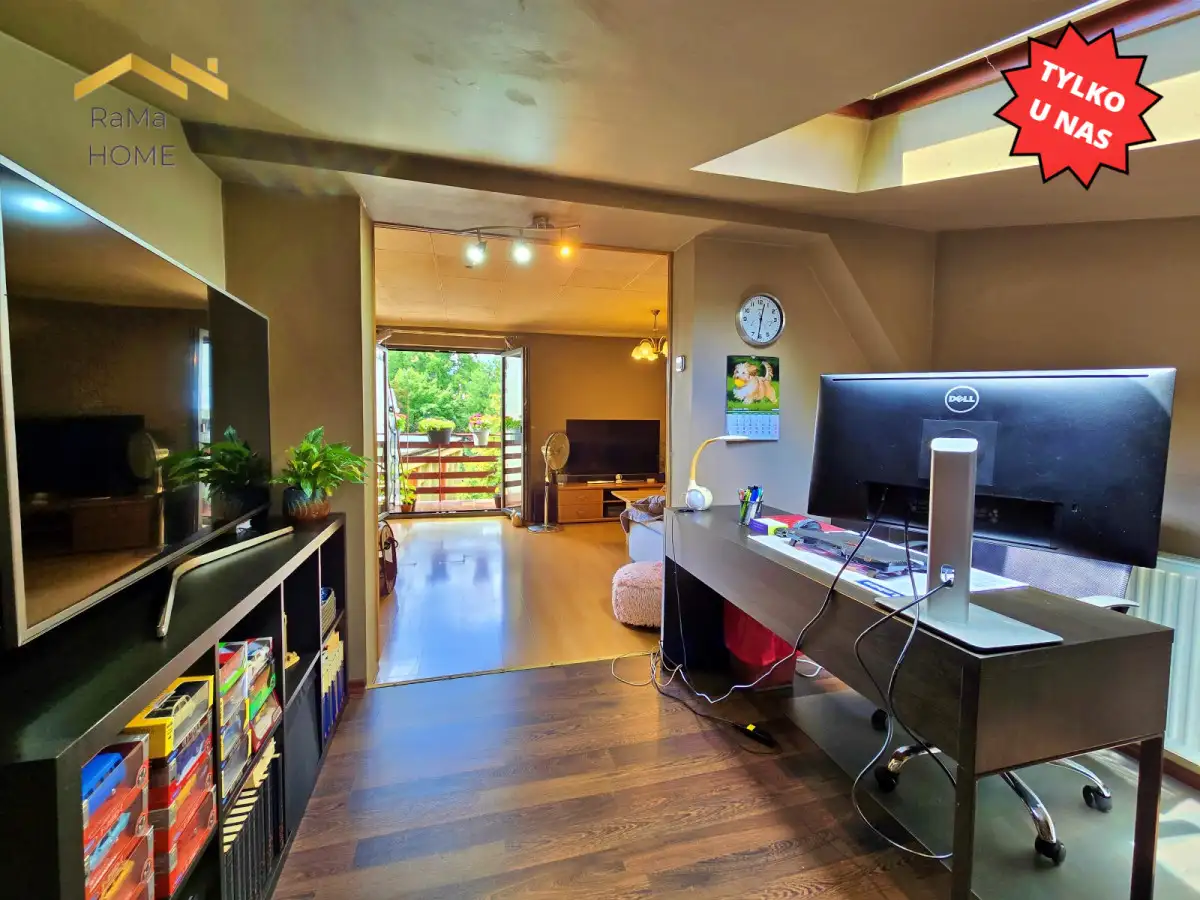 II piętro 65m² (poddasze): 3 pokoje (jeden z balkonem), kuchnia z oknem, otwarta na salon, łazienka
