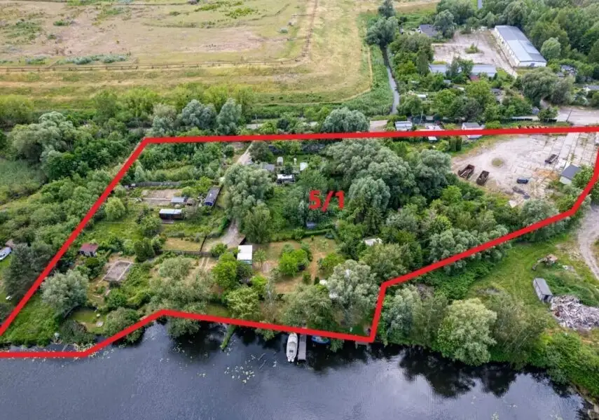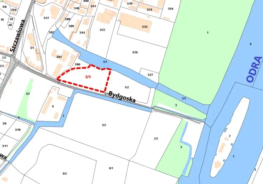 2) Nieruchomość stanowiąca działkę numer 5/1 w obrębie numer 1063 utwardzona jest częściowo płytami betonowymi, w dużej mierze ogrodzona ogrodzeniem z siatki metalowej, zamykana bramą wejściową, przesuwną. W jej granicach usytuowany jest budynek jednokondygnacyjny, murowany, niepodpiwniczony (niemieszkalny) o charakterze biurowo-socjalnym o numerze identyfikacyjnym Id: 326201_1_1063_111.BUD o powierzchni zabudowy 49 m², waga najazdowa samochodowa (30 ton), pozostałość otwartego, murowanego, kamiennego zbiornika (silos), parterowy, murowany budynek o powierzchni zabudowy 45 m² o numerze identyfikacyjnym ID: 326201_1.1063.119.BUD, który stanowi samowolę budowlaną dniu 05 listopada 2007 r., wydana została decyzja przez Powiatowego Inspektora Nadzoru Budowlanego o nakazie jego rozbiórki z odroczeniem, zapotrzebowania terenu na cele zgodne z planem ogólnym zagospodarowania miasta Szczecina. Część tego budynku znajduje się na działce numer 5/3 w obrębie numer 1063, przeznaczonej pod drogę. Działka numer 5/1 leży w bezpośrednim sąsiedztwie działki numer 4/1 o użytku „Wp” w obrębie numer 1063 stanowiącej własność Skarbu Państwa, która nie stanowi gruntu pokrytego śródlądowymi wodami płynącymi, co do których Wody Polskie wykonują prawa właścicielskie Skarbu Państwa w myśl ustawy Prawo wodne. Na działce numer 4/1 z obrębu numer 1063 zlokalizowany jest kanał stanowiący urządzenie wodne, wykonany w celu stworzenia miejsc postojowych dla jednostek pływających oraz możliwości transportowania materiałów drogą wodną do sąsiadujących z kanałem przedsiębiorstw. Przez działkę numer 5/1 przebiega czynna instalacja wodociągowa Ø32 PE (na potrzeby zasilania istniejącego budynku), nie będąca własnością Zakładu Wodociągów i Kanalizacji Spółka z o.o., sieć kanalizacji deszczowej Ø500 oraz Ø250 odprowadzająca wody deszczowe do rzeki Bukowej.