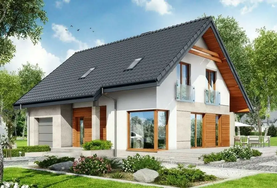 Prosta i tradycyjna bryła, przestronne, jasne wnętrza, salon z kominkiem i tarasem.