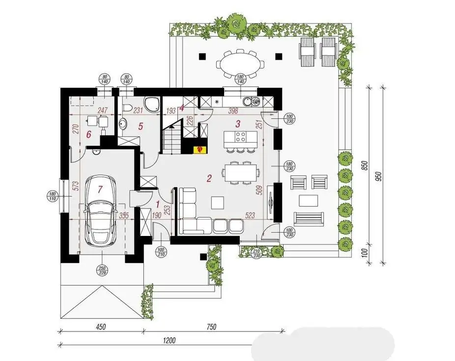 PARTER - salon z kominkiem, kuchnia z jadalnią + spiżarka, łazienka, komunikacja, pomieszczenie gospodarcze, garaż w bryle budynku,