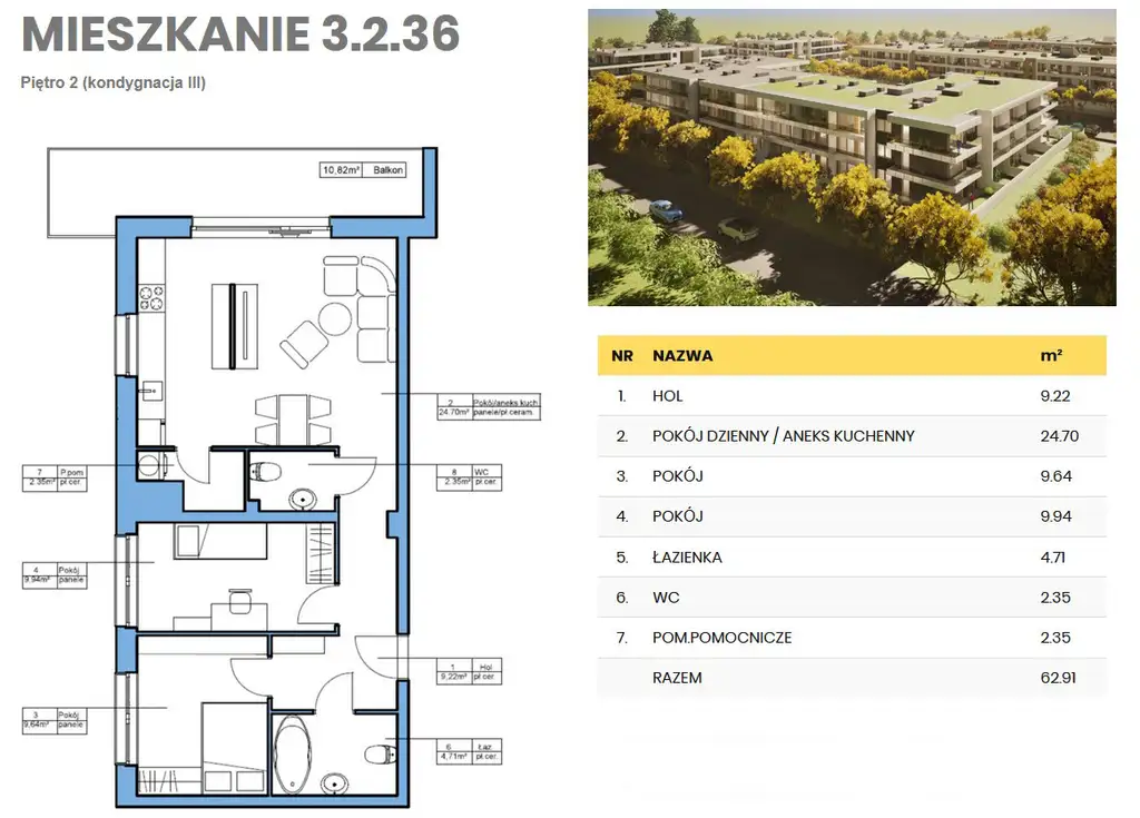 Mieszkanie o pow. 62,91 m², składające się z 3 pokoi, aneksu kuchennego, łazienki z wc, przedpokoju.