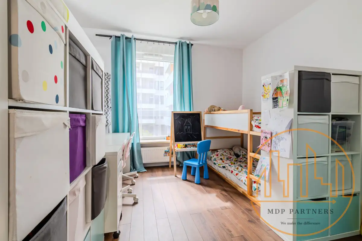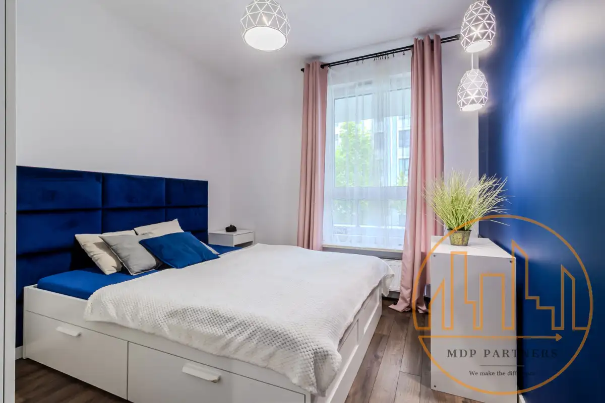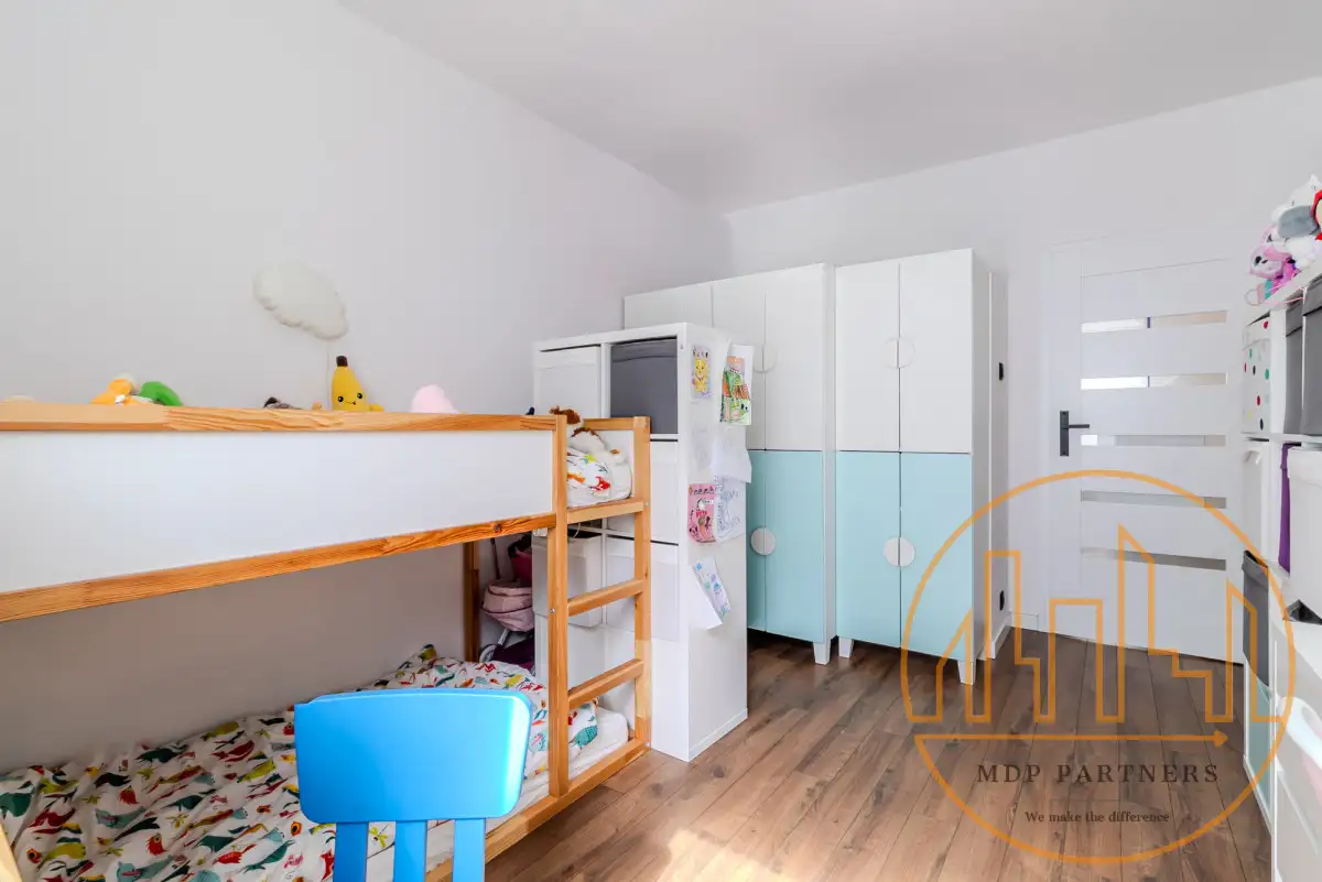 Sypialnia z łóżkiem małżeńskim 160x200 z pojemnymi szufladami i szafą PAX. Drugi pokój zaaranżowany jako przestrzeń dziecięca.
