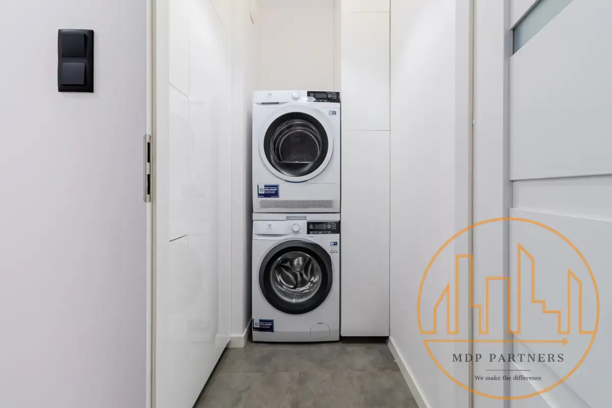 Praktyczna garderoba z pełną zabudową oraz pralką i suszarką Electrolux. W łazience: wanna z deszczownicą, umywalka nablatowa oraz liczne szafki do przechowywania.