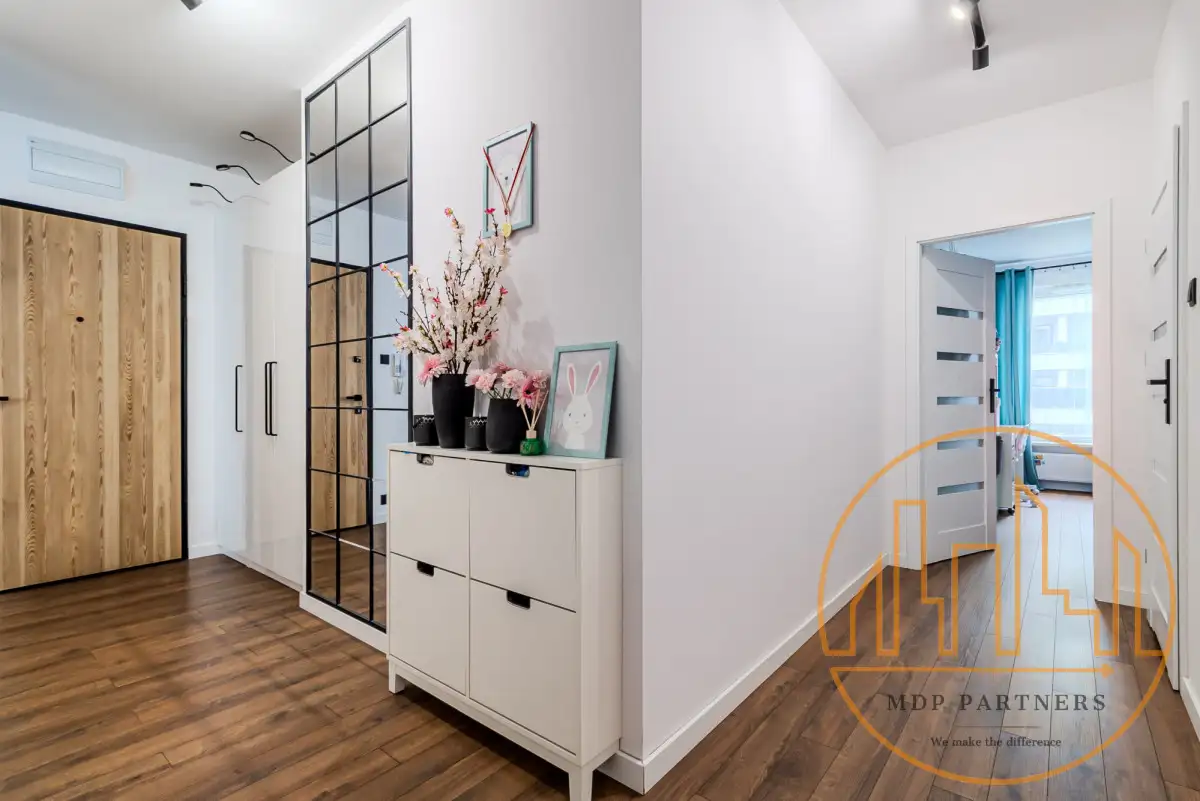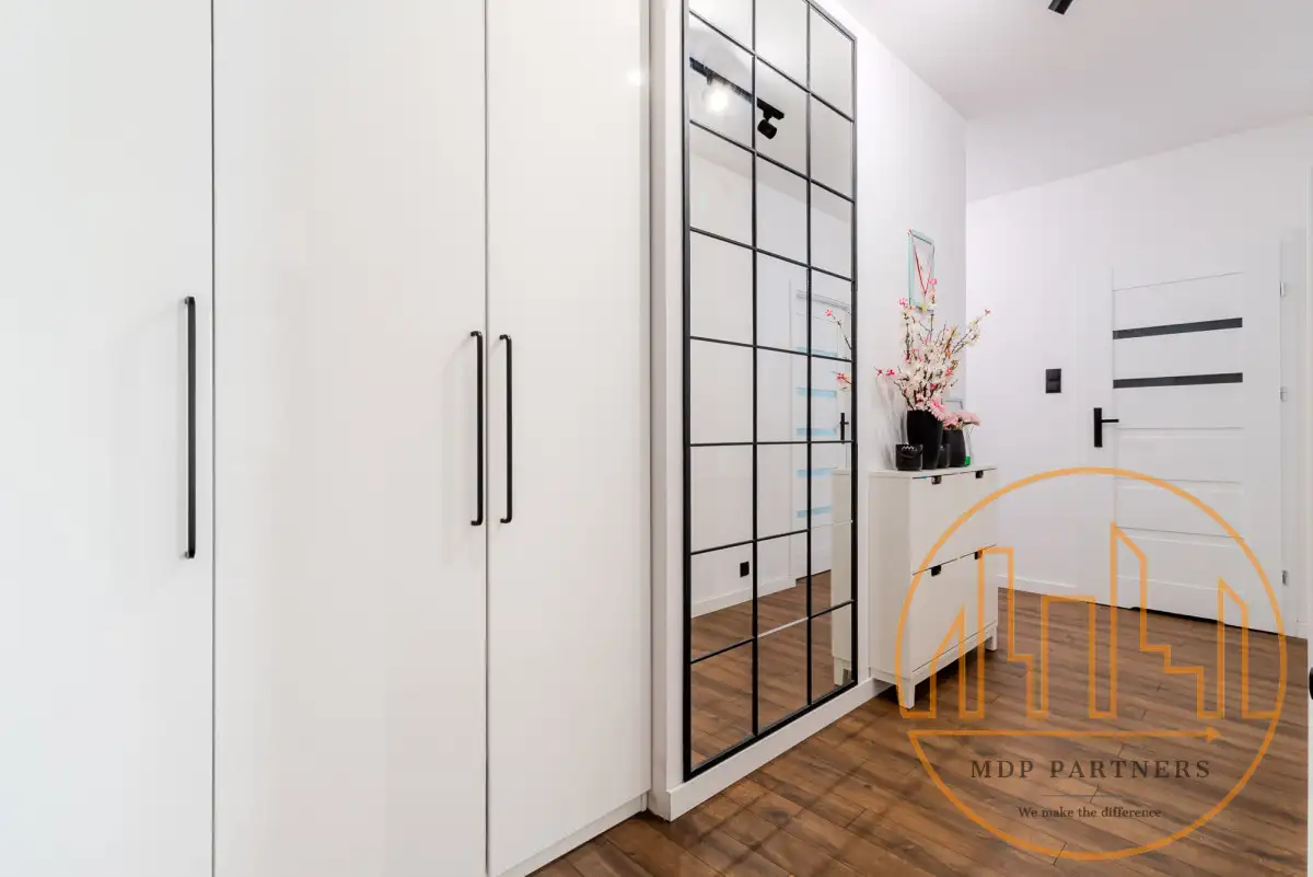 W przedpokoju znajduje się lustro, pojemna szafa oraz szafka na buty.