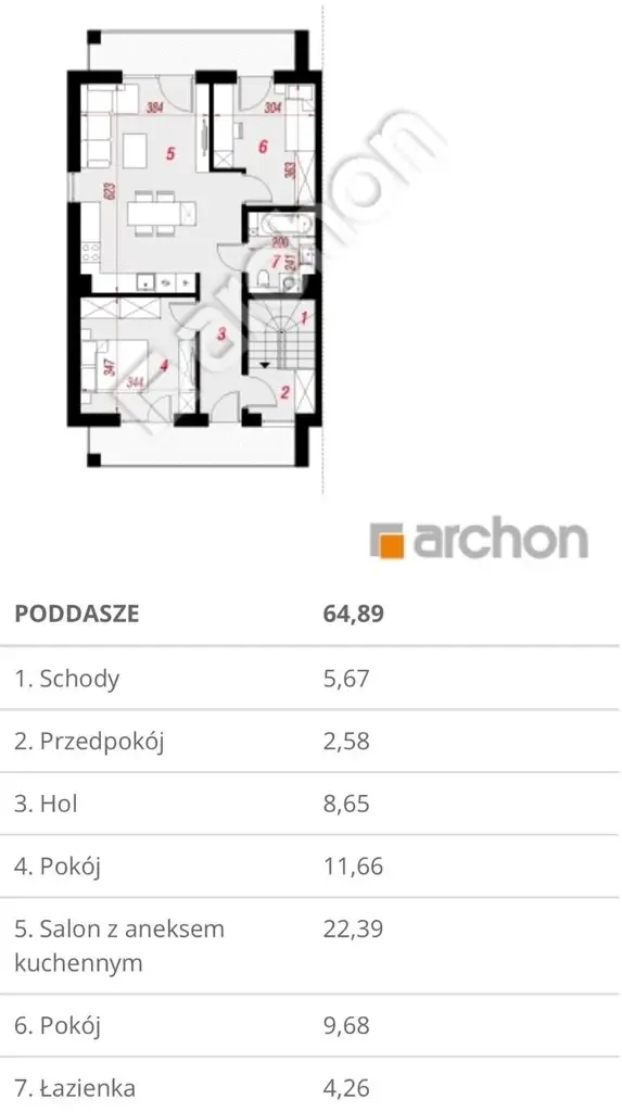 Lokal mieszkalny o powierzchni użytkowej 64,89 m², położony na pierwszym piętrze budynku, składa się z salonu z aneksem kuchennym i wyjściem na balkon, dwóch pokoi, łazienki z WC oraz przedpokoju.