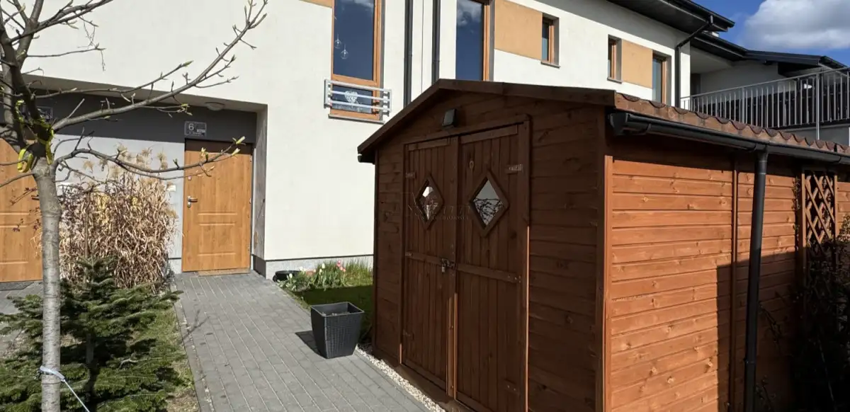 - ogród z oświetleniem i pomieszczeniem na narzędzia ogrodowe.