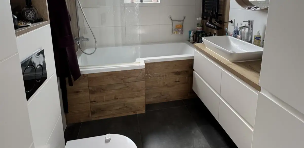 Dodatkowo centralnie sterowane ogrzewanie podłogowe na wodę w przedpokoju, kuchni, toalecie oraz w łazience.