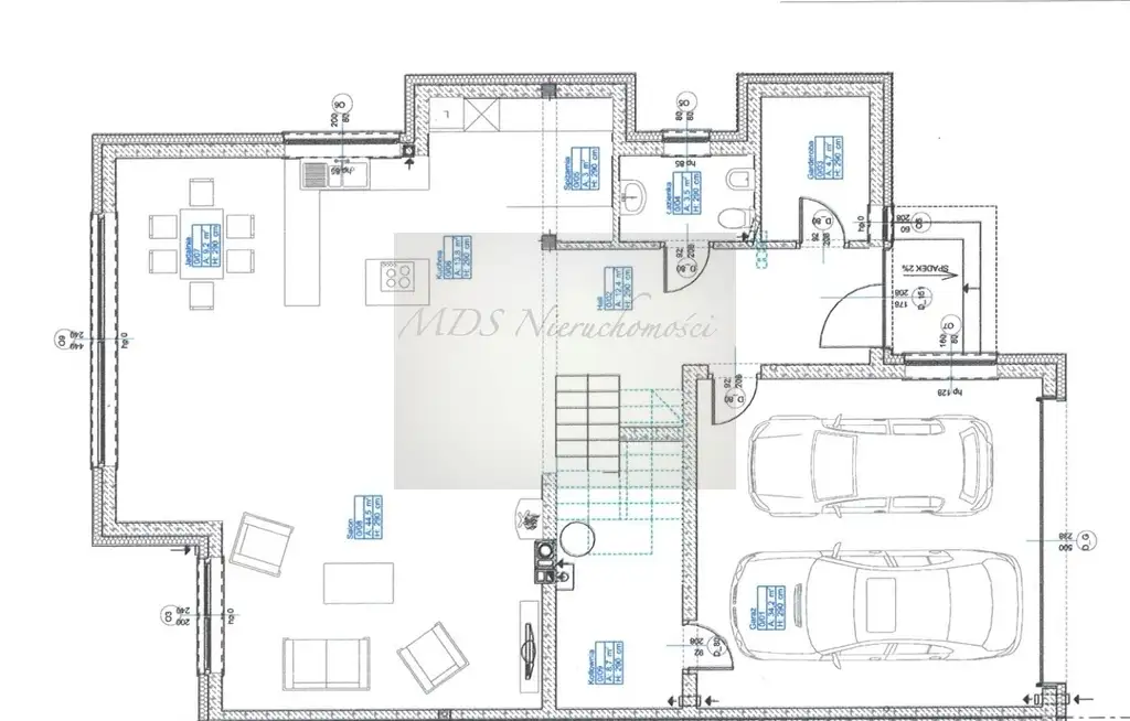 łazienka, garderoba, garaż na dwa auta i kotłownia/schowek.