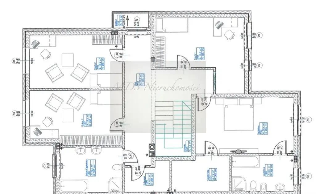 Trzy sypialnie: 19, 18 i 18 m² korzystają z łazienki 10 m². Jest także pomieszczenie na pralnię/schowek.