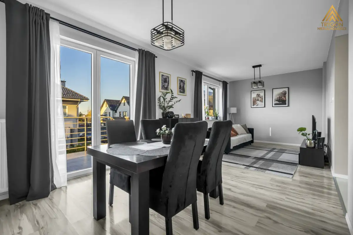 - salon z jadalnią i aneksem kuchennym około 32 m², ekspozycja okien zachodnia i północna z wyjściem na taras i duży ogród 150 m²