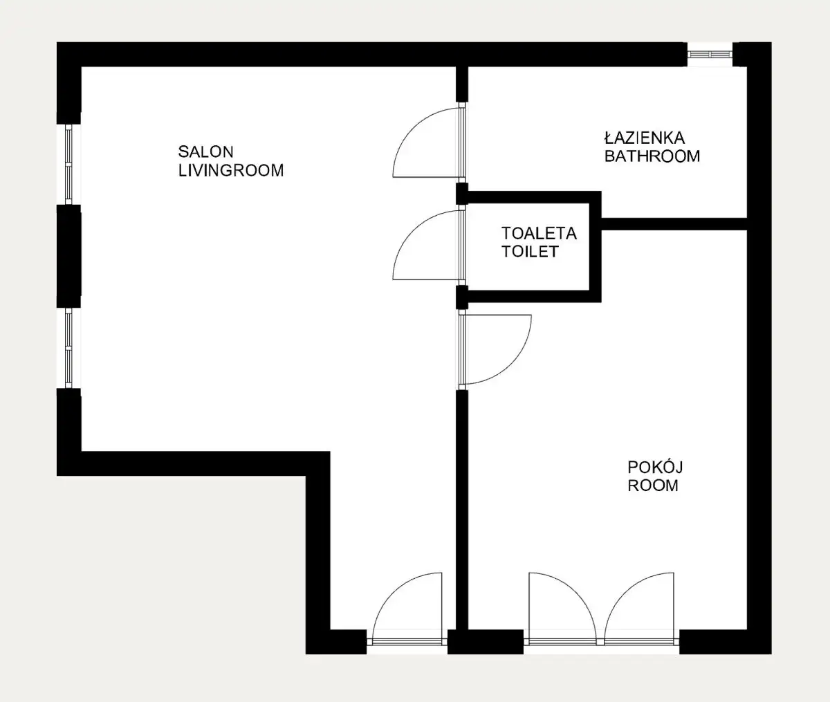 Pokoje: sypialnia, salon, otwarta kuchnia, przedpokój, łazienka