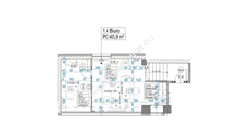 1) Biuro + aneks kuchenny (wyposażony w lodówkę, zmywarkę i mikrofalę )