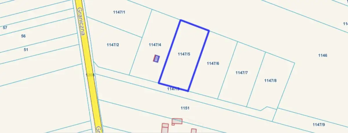 o powierzchni 2251 m² w trzeciej linii zabudowy o wymiarach 40,9 x 63,1 m. Numer działki 1147/5