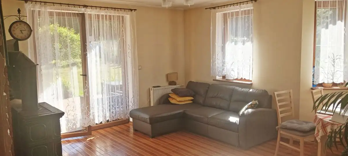 -salon połączony z kuchnią, z którego jest wyjście na duży 34 m² taras. pokój, łazienka z prysznicem, przedpokój, kotłownia, garaż,