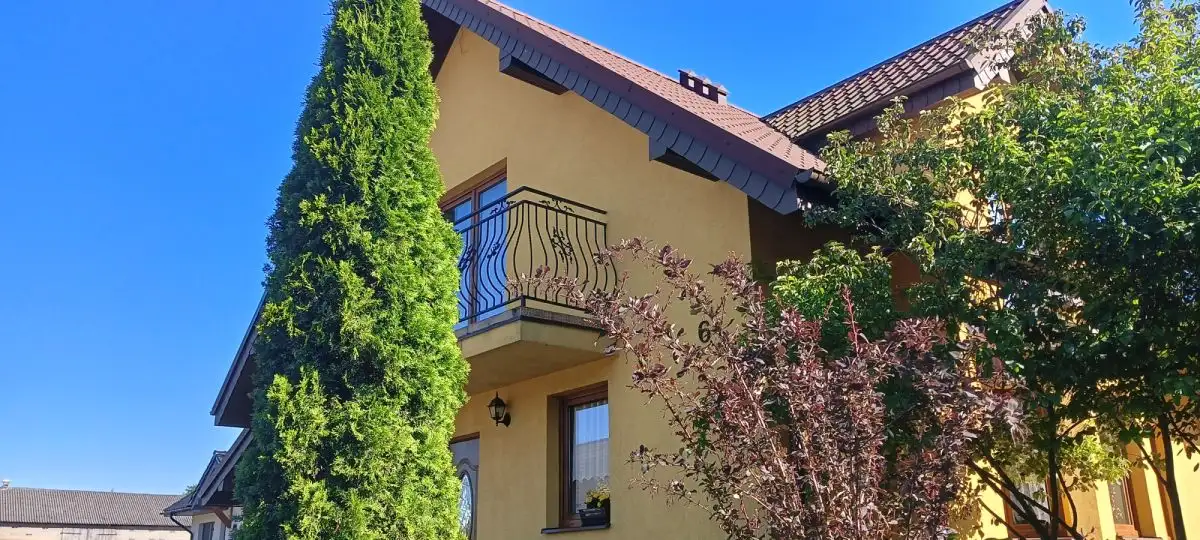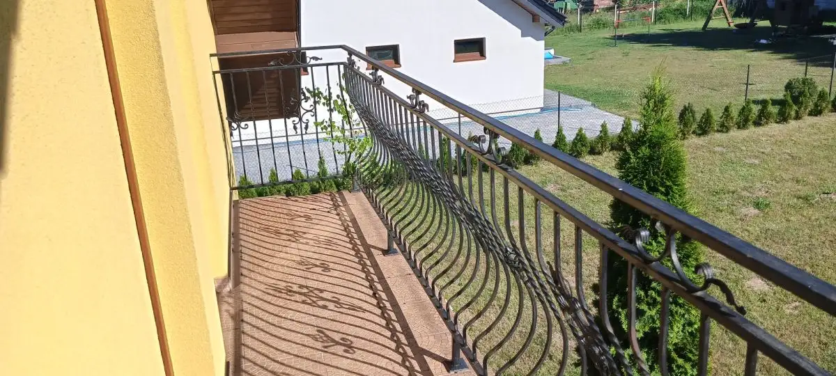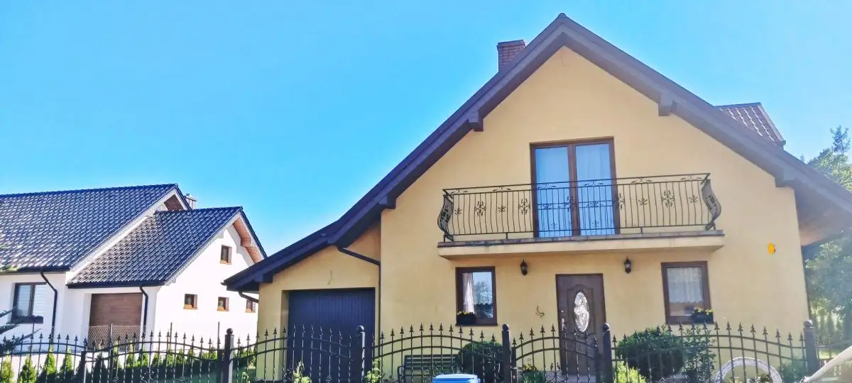 Posesja ogrodzona z frontu ogrodzenie kute.