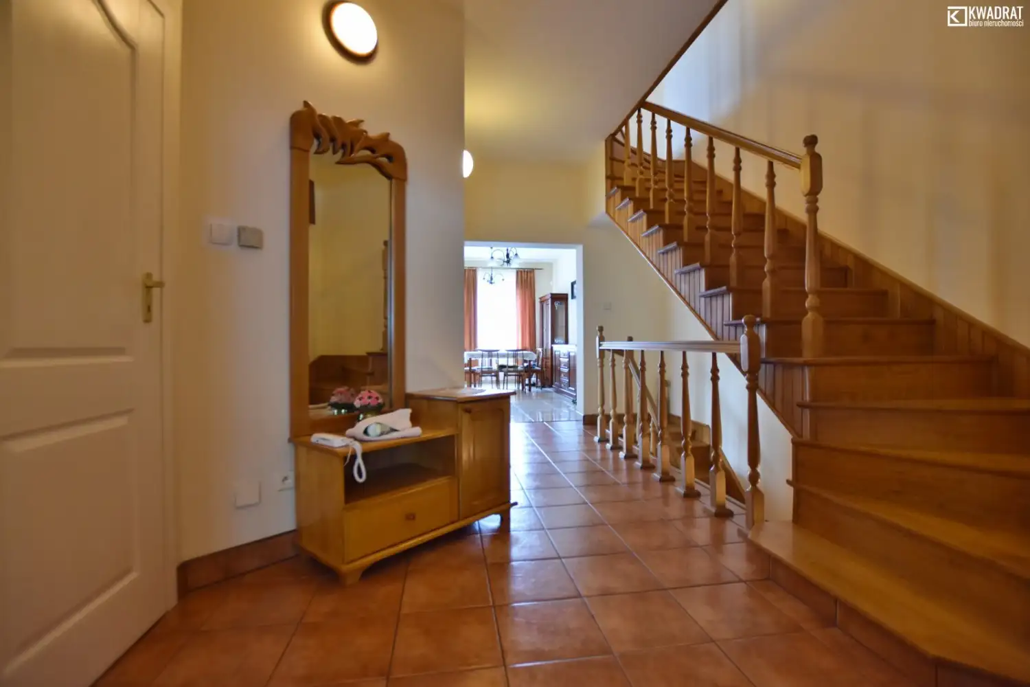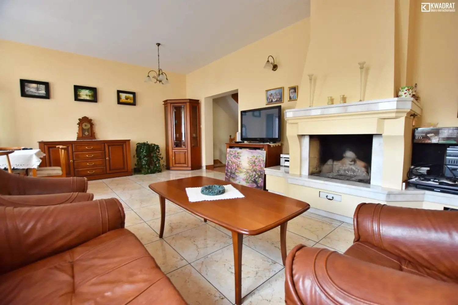 Przestrzeń dzienna (83,90 m²) parter domu to komfortowa i funkcjonalna przestrzeń dzienna, zaprojektowana z myślą o codziennym wypoczynku i życiu rodzinnym. Znajduje się tu przestronny salon z kominkiem, który nadaje wnętrzu przytulny, domowy klimat. Z salonu prowadzi wyjście na taras oraz do ogrodu - idealne miejsce na poranną kawę lub relaks po pracy. Drewniane meble w salonie i pozostałych pomieszczeniach podkreślają elegancki, klasyczny charakter wnętrz. Duża, oddzielna kuchnia zapewnia wygodę podczas gotowania i codziennego funkcjonowania - to doskonałe miejsce zarówno do przygotowywania posiłków, jak i ich wspólnego celebrowania. Na parterze znajduje się również: - ustawny pokój, który może pełnić funkcję gabinetu, sypialni gościnnej lub pokoju dla członka rodziny, - pełna łazienka, - oddzielna toaleta, - przestronny hall, który zapewnia wygodny dostęp do wszystkich pomieszczeń. Ta część domu łączy w sobie reprezentacyjny charakter z pełną funkcjonalnością, co czyni ją sercem codziennego życia.
