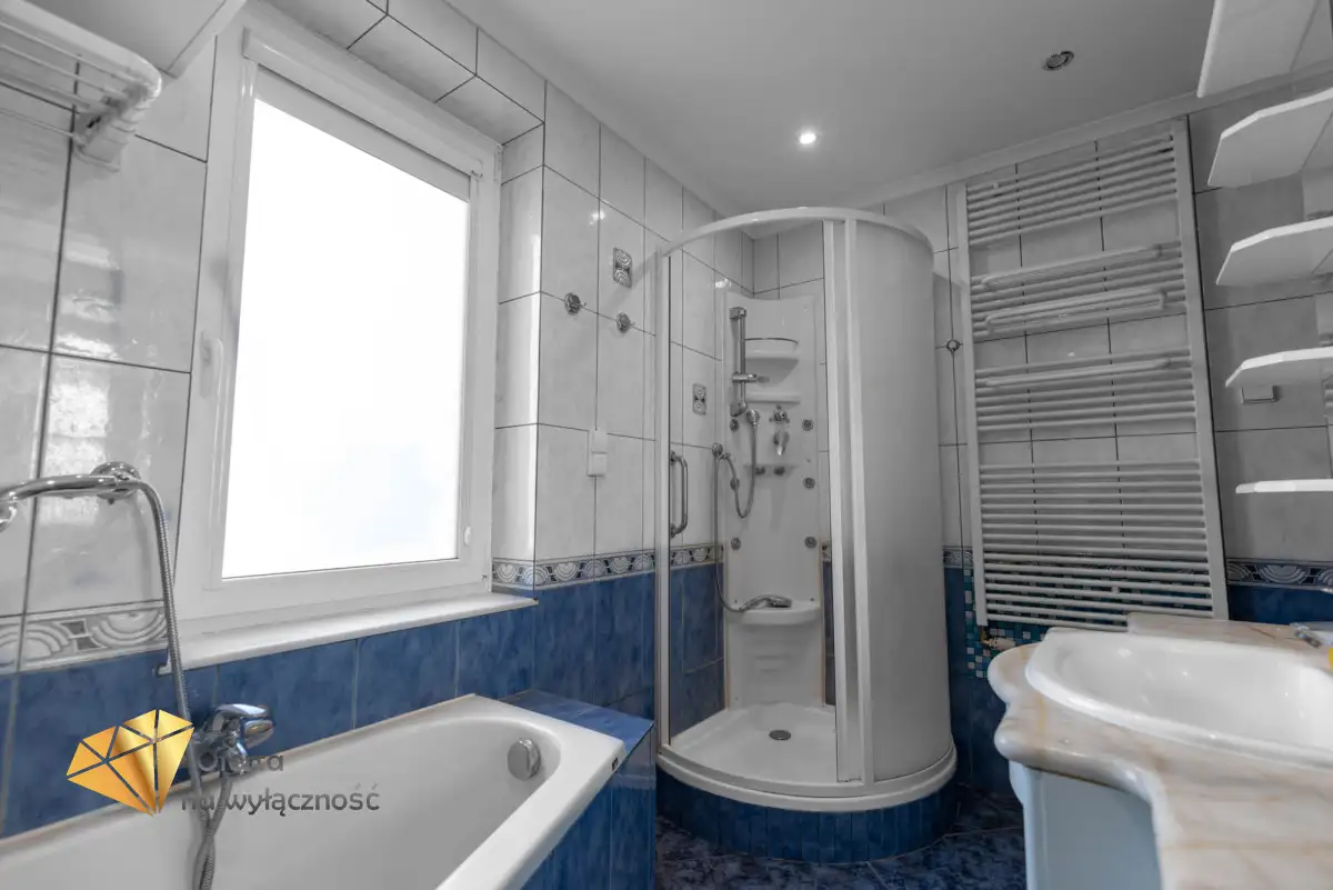 W łazience z oknem są zarówno wanna jak i kabina prysznicowa oraz bidet.
