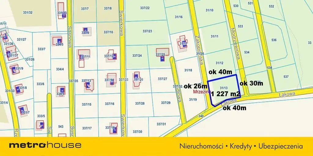 Narożna parcela o powierzchni 1 227 m² u sytuowana jest w najlepszej lokalizacji w tej miescowości.