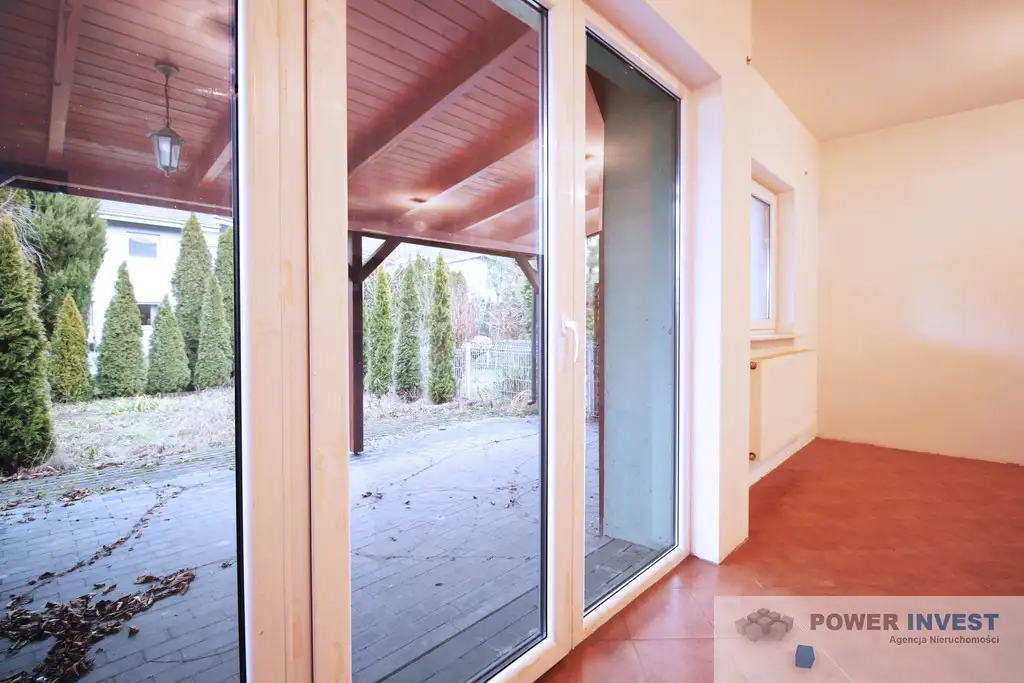 Dom położony jest na 2 arowej działce. Z salonu jest wyjście na zadaszoną werandę oraz do ogródka. Od przodu domu mamy wjazd do garażu o powierzchni około 17m². Dodatkowo podjazd przed posesją pomieści 2 aut. Okna w salonie oraz w pokojach skierowany są na południowy - wschód, dzięki czemu dom jest jasny i dobrze oświetlony. Na poddaszu, mamy dodatkowo okno połaciowe.