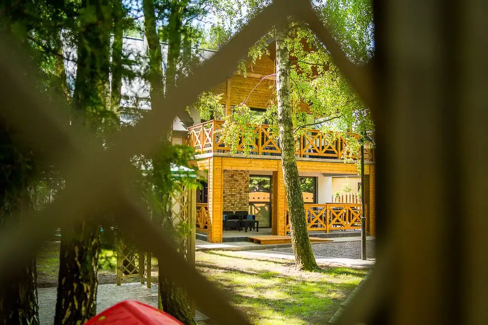 Posesja ogrodzona, plac zabaw dla dzieci, teren zalesiony - starodrzew, brama na pilota do pensjonatu, droga dojazdowa zamykana na dodatkową bramę tylko dla mieszkańców ulicy Topolowej.