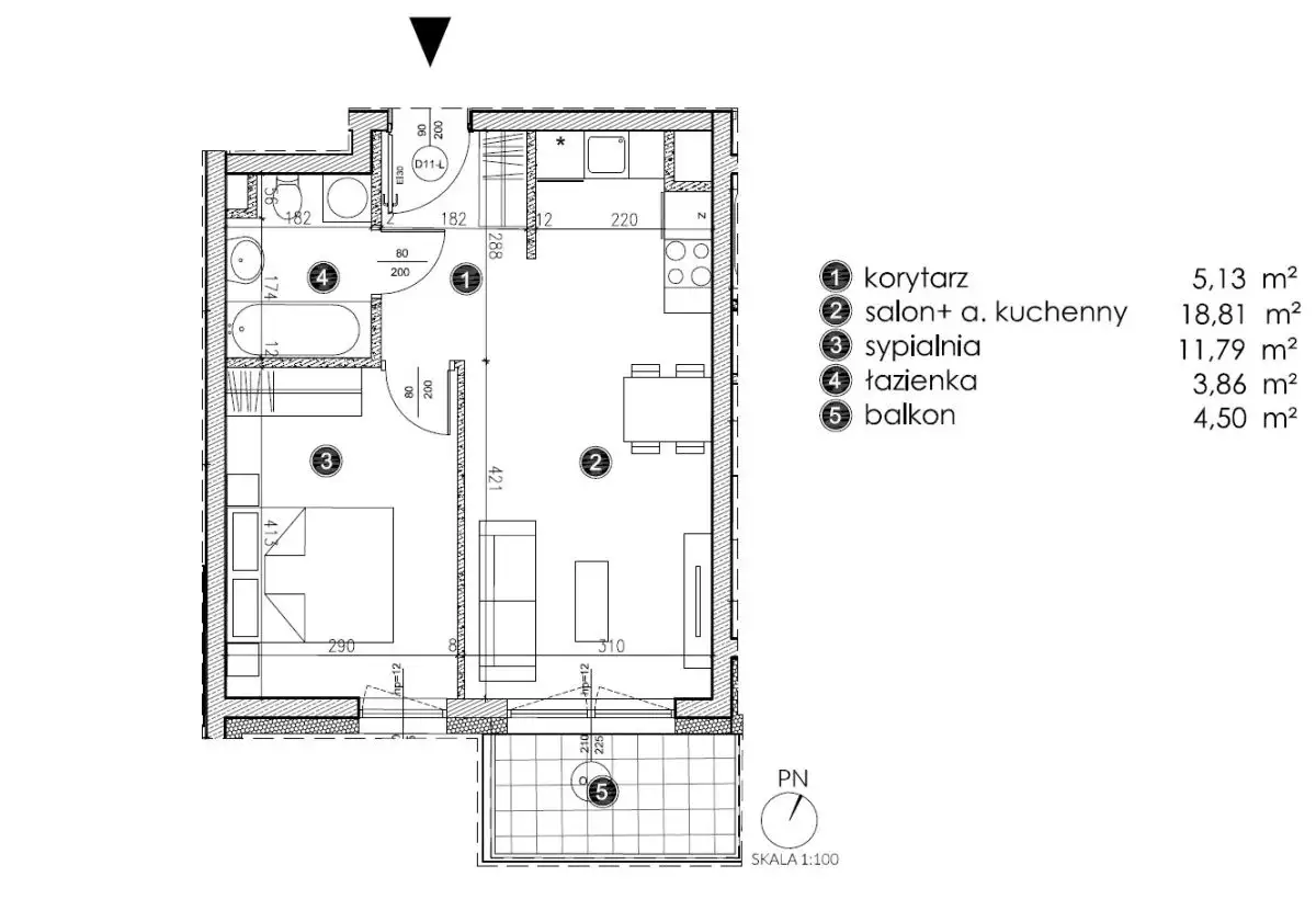 Opis mieszkania:-Pokój dzienny z aneksem kuchennym o pow. 18,81 m² z wyjściem na balkon o pow. 4,50 m²
