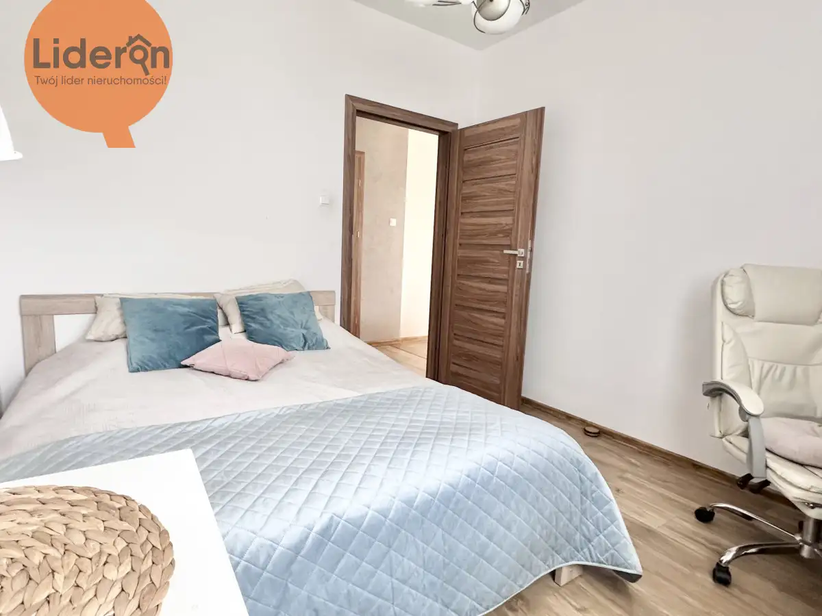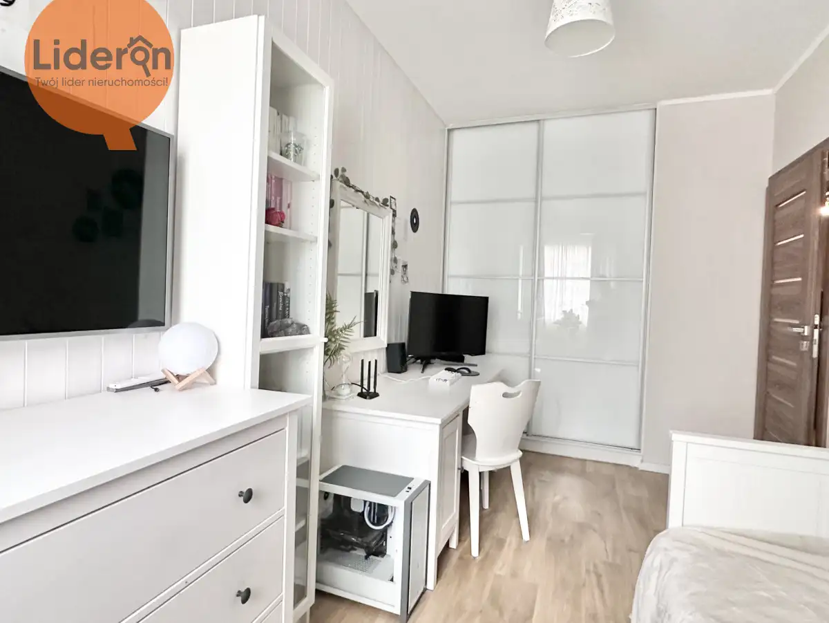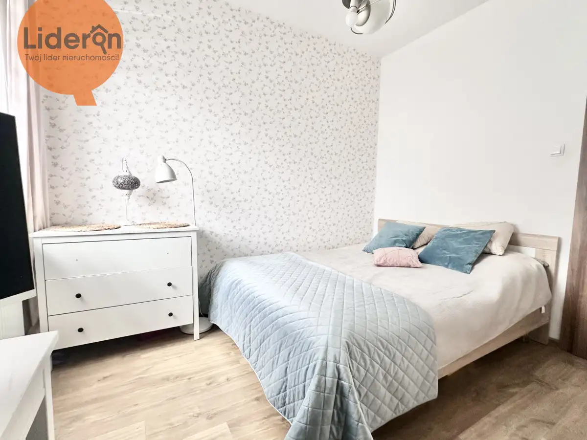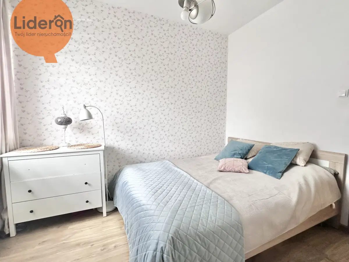 W większej sypialni (11,36m²) znajduje się szafa łóżko oraz szafki nocne.