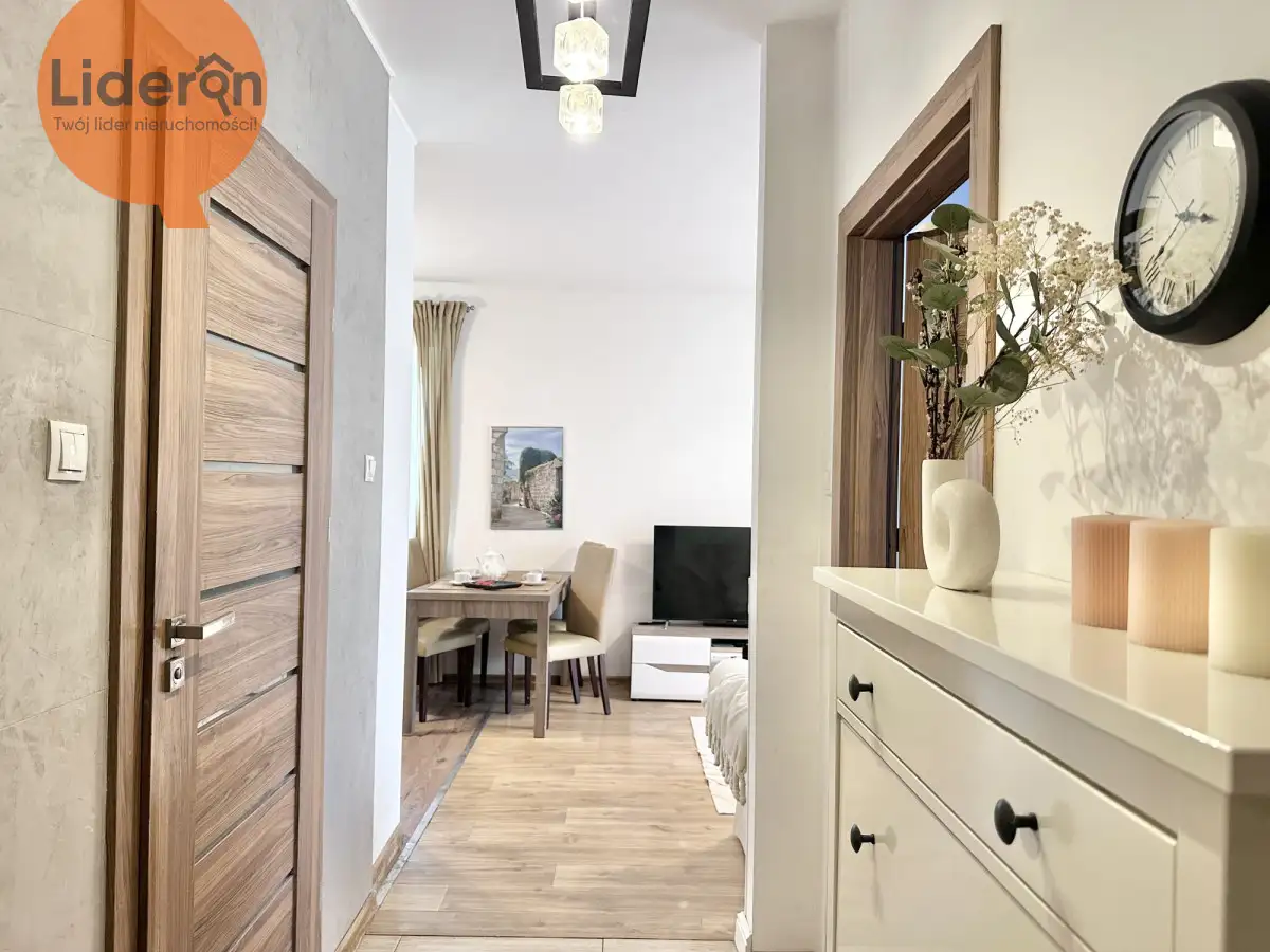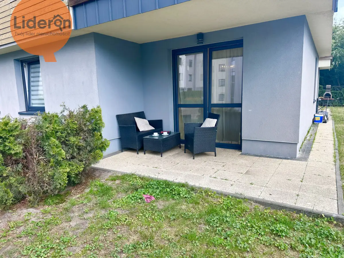 W salonie mieści się rozkładana sofa, dwie komody stół z krzesłami. Z salonu jest wyjście na ogrodzony ogródek ok 112 m², który przed wejściem jest zadaszony i ma część tarasową ok. 9 m². Daje to komfort dla wypoczynku i relaksu.