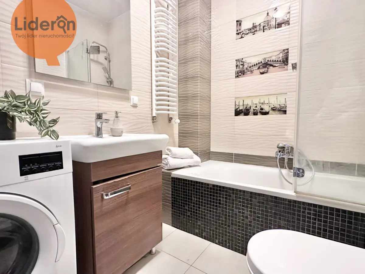 Łazienka wyposażona jest w wannę z dwoma kranami i prysznicem, umywalkę z szafkami i pralkę.