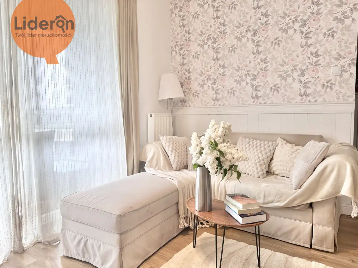 W salonie mieści się rozkładana sofa, dwie komody oraz stół z krzesłami. Z salonu jest wyjście na ogrodzony ogródek ok 7 m², przed wejściem jest zadaszony. Daje to komfort dla wypoczynku i relaksu.