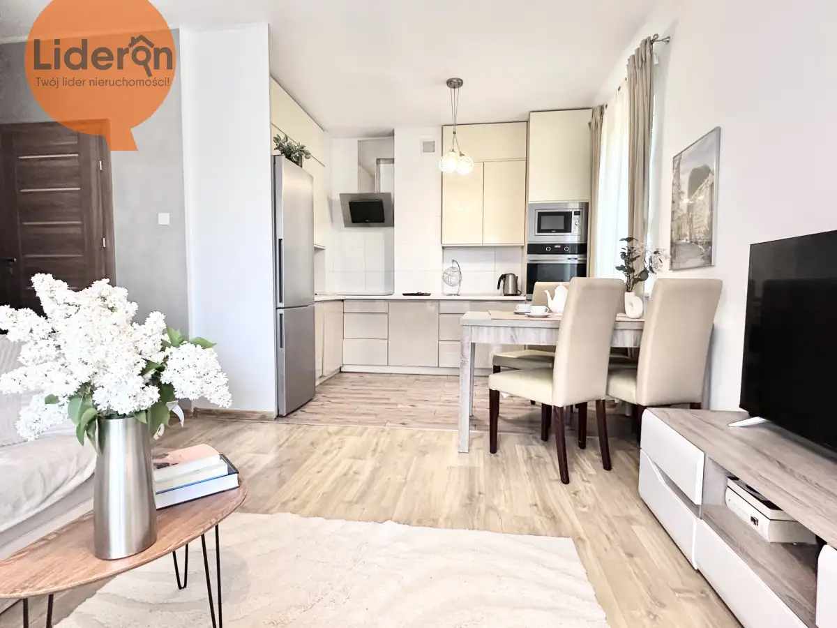 Kuchnia wyposażony jest w meble w zabudowie oraz płytę indukcyjną, piekarnik, zlew, zmywarkę, okap i lodówkę.