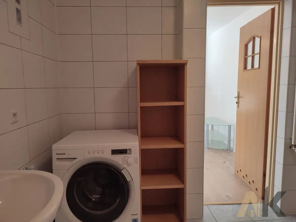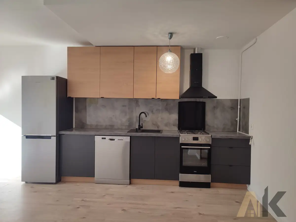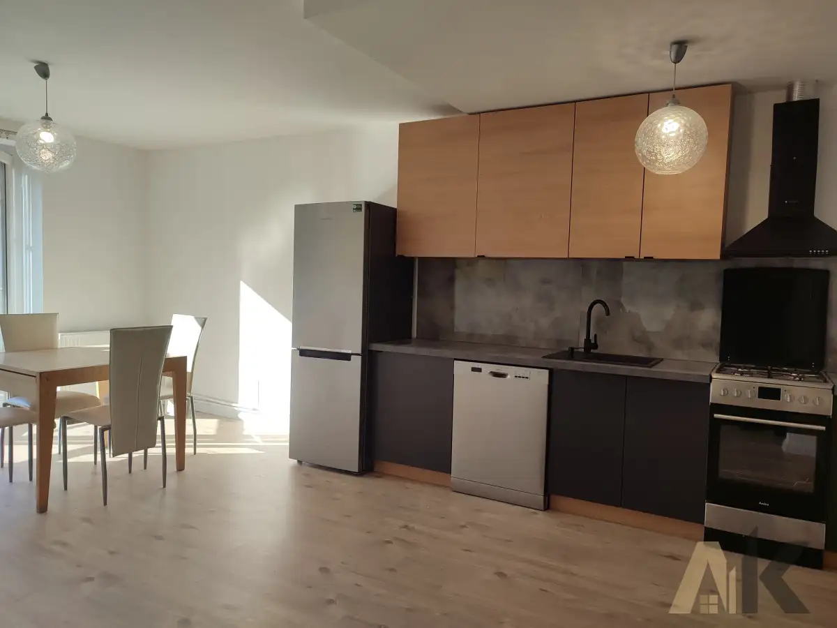 Wyposażenie: Mieszkanie jest w pełni umeblowane i wyposażone w sprzęt AGD (lodówka, zmywarka, pralka, kuchenka). W salonie znajduje się stół z krzesłami, rozkładana sofa.