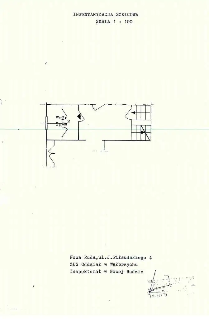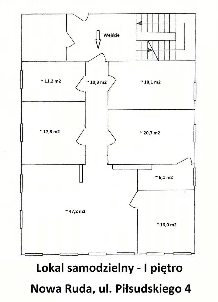 Lokal niemieszkalny położony w Nowej Rudzie przy ul. Piłsudskiego 4 składa się z ośmiu pomieszczeń biurowych i korytarza o łącznej powierzchni 145,90 m² usytuowanych na I piętrze oraz z pomieszczenia przynależnego (WC) o powierzchni 9,40 m² znajdującego się na parterze.