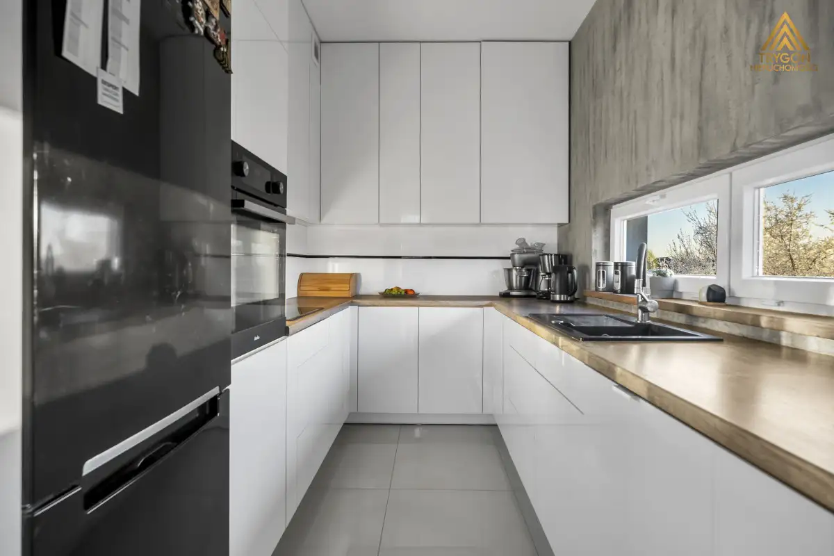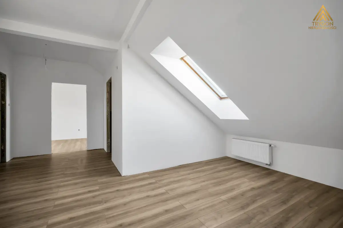- salon z jadalnią i aneksem kuchennym około 32 m², ekspozycja okien zachodnia i północna z wyjściem na taras i duży ogród 150 m²