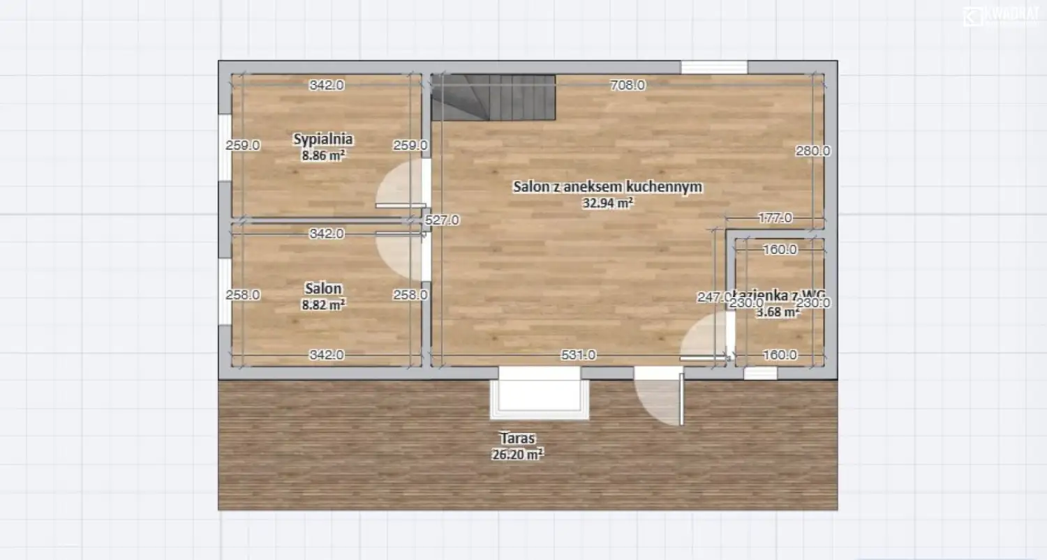 Salonu o pow. 25,99 m² z aneksem kuchennym o pow. 4,96 m², spiżarnią o pow. 2 m² i wyjściem na taras o pow. 26,2 m²,
