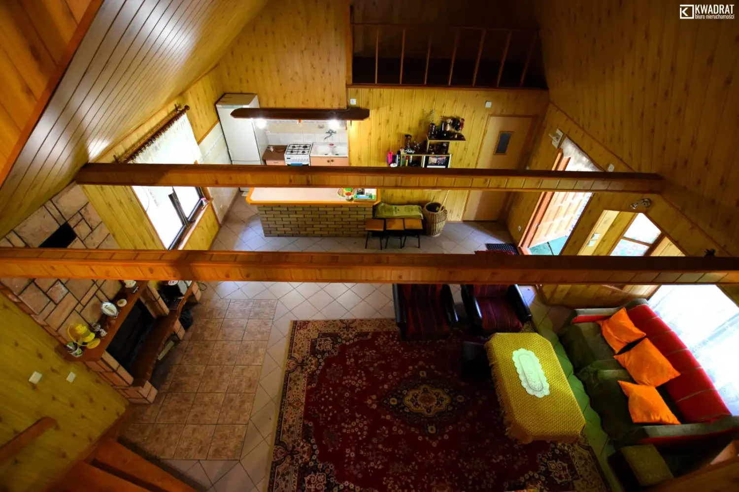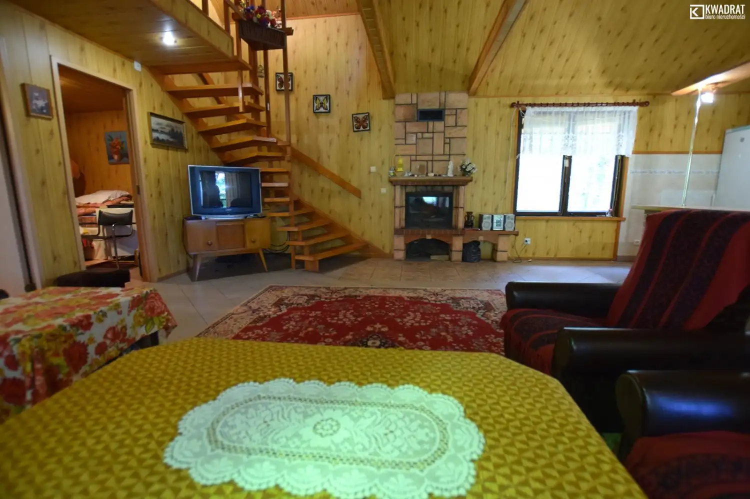Dom wyposażony w kominek na drewno z rozprowadzeniem na salon i poddasze.