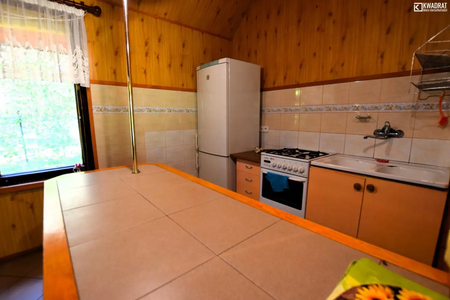 Aneks kuchenny wyposażona w zabudowę kuchenną i sprzęt AGD sąsiadujący ze spiżarnią, w której znajduje się bojler elektryczny.