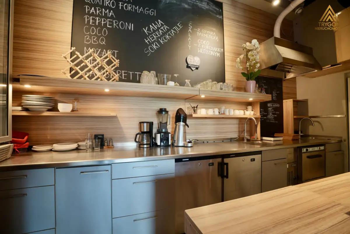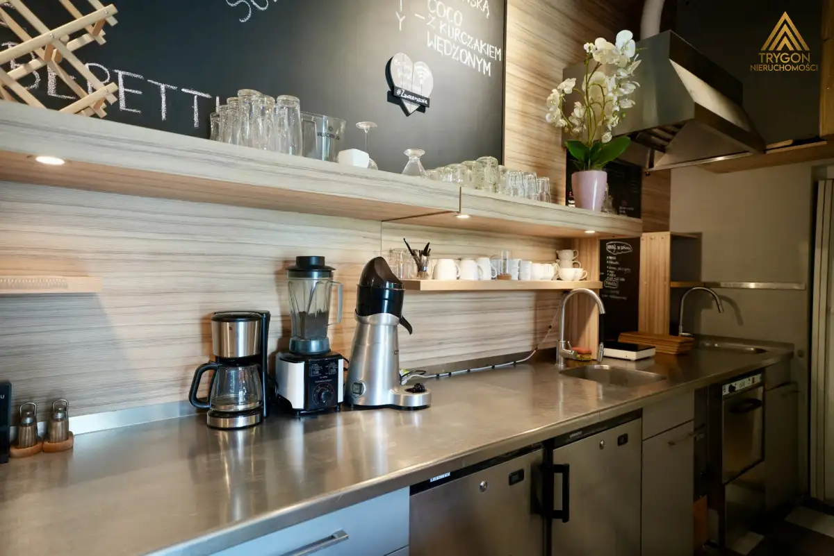 Oferowany lokal o powierzchni 43 m² składa się z przestronnej sali głównej, która może pełnić funkcję części jadalnej lub baru, dwóch funkcjonalnych łazienek, holu oraz dobrze wyposażonej kuchni. Układ pomieszczeń został zaprojektowany z myślą o maksymalnej ergonomii i wygodzie obsługi gości oraz personelu. Dzięki temu lokal jest gotowy do szybkiego rozpoczęcia działalności gastronomicznej.