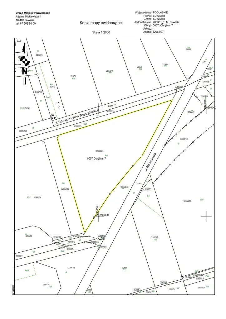 na sprzedaż nieruchomości niezabudowanej, stanowiącej własność Miasta Suwałk oznaczonej działką nr 32662/27 o powierzchni 2,2104 ha, położonej przy ul. Edwarda Lecha Wojczyńskiego w Suwałkach, wchodzącej w skład nieruchomości oznaczonej księgą wieczystą nr SU1S/00037557/0. Na działce znajduje się sieć energetyczna średniego napięcia. Nabywca zobowiązany będzie do nieodpłatnego znoszenia tej sieci oraz nieodpłatnego udostępniania wejścia na grunt w przypadku jej awarii bądź konserwacji. Działka zgodnie z miejscowym planem zagospodarowania przestrzennego rejonu ulicy Raczkowskiej w Suwałkach zatwierdzonym Uchwałą Nr LXI/805/2023 Rady Miejskiej w Suwałkach z dnia 27.09.2023 roku objęta jest konturem 15 KL/I/U - teren komunikacji lotniczej oraz obiektów i usług towarzyszących lotnisku. Ustala się lokalizację zabudowy związanej z funkcjonowaniem lotniska Suwałki, w tym: szkół lotniczych i spadochronowych, zabudowy składowo - magazynowej, parkingów, centrów logistycznych, usług hotelowych i gastronomicznych oraz innych usług wspomagających funkcjonowanie lotniska. Dopuszcza się możliwość realizacji: obiektów i urządzeń małej architektury, budynków i budowli pomocniczych oraz urządzeń służących utrzymaniu porządku. Dodatkowo dopuszcza się lokalizację urządzeń wytwarzających energię z odnawialnych źródeł energii w postaci ogniw fotowoltaicznych, w tym o mocy zainstalowanej większej niż 500 kW, zgodnie z przepisami szczególnymi i o ile nie stoi to w sprzeczności z funkcjonowaniem lotniska. Nieruchomość przeznaczona jest do sprzedaży w drodze przetargu ustnego nieograniczonego.