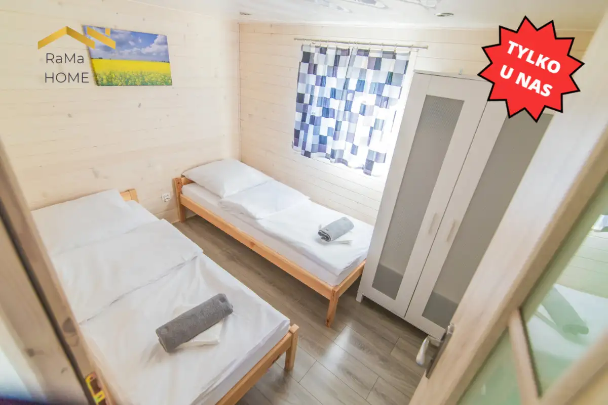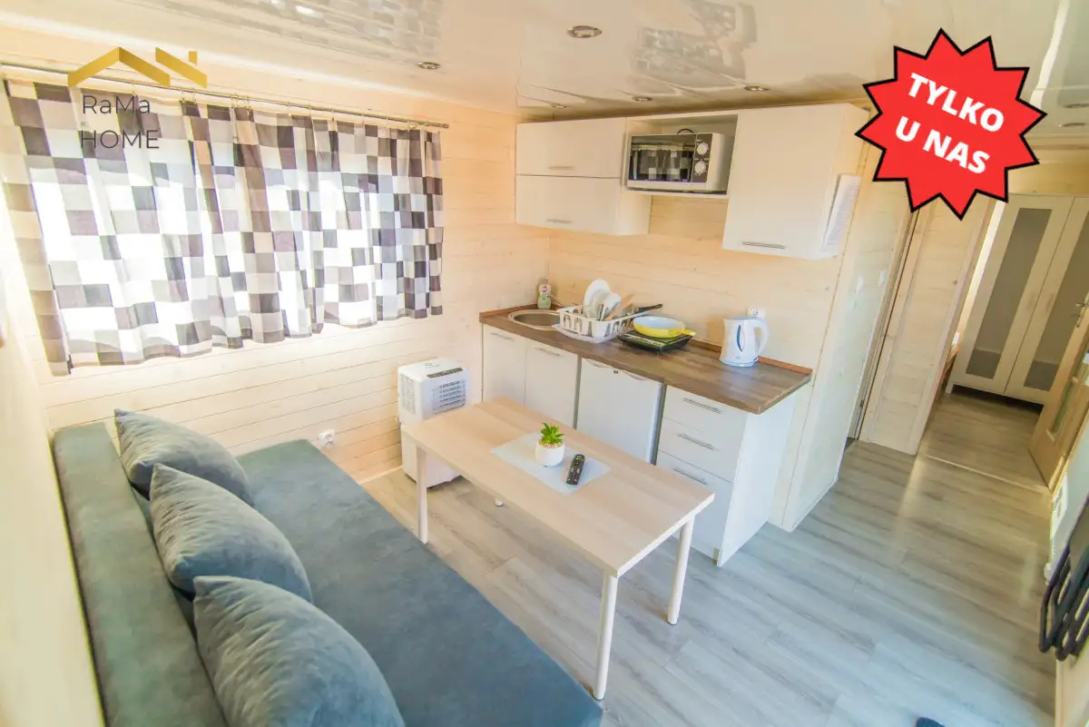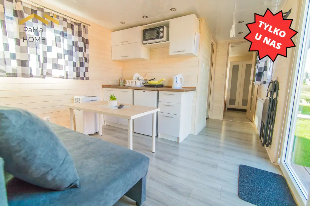- domki wyposażone w telewizor z płaskim ekranem, aneks kuchenny z lodówką, mikrofalą, czajnikiem i kuchenką wraz z niezbędnymi naczyniami, łazienkę z prysznicem, rozkładaną sofę w saloniku oraz sypialnie z szafą i łóżkami