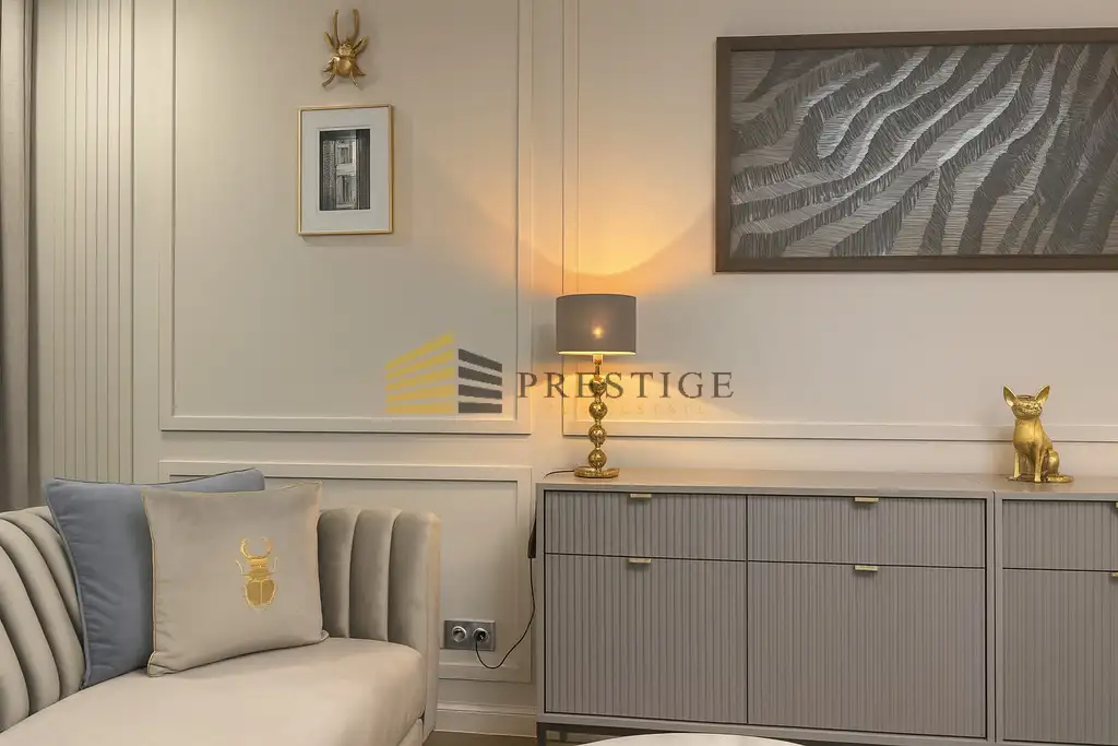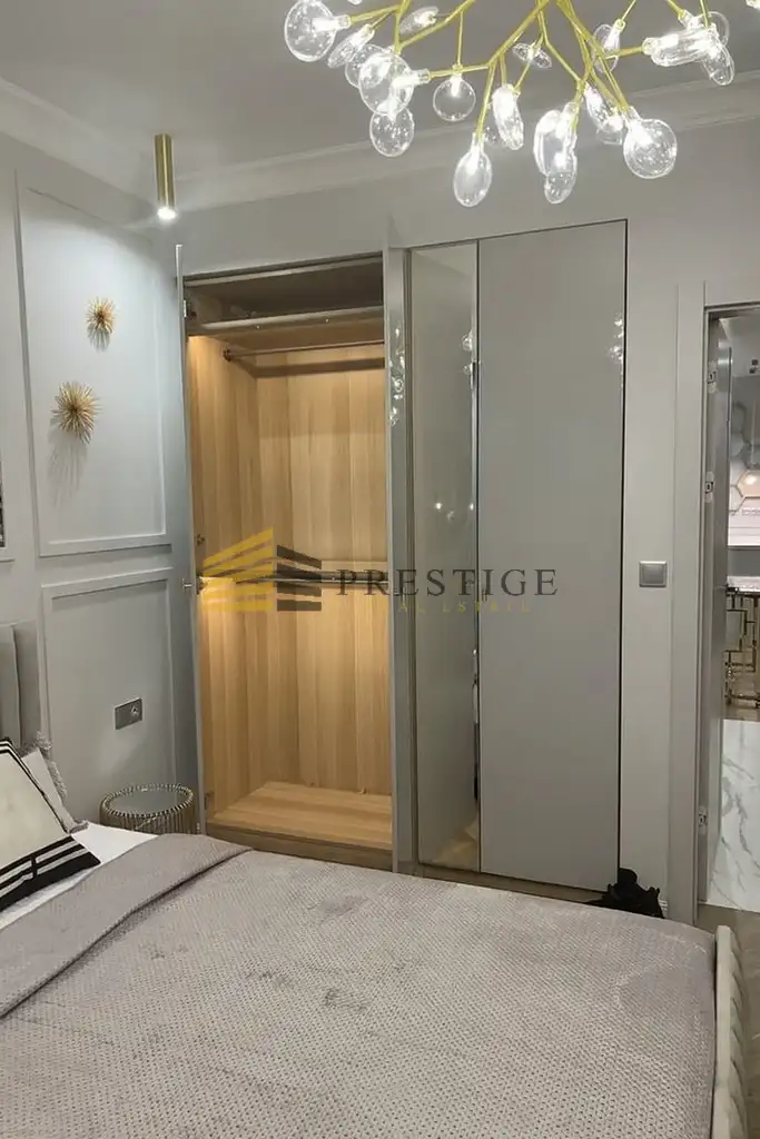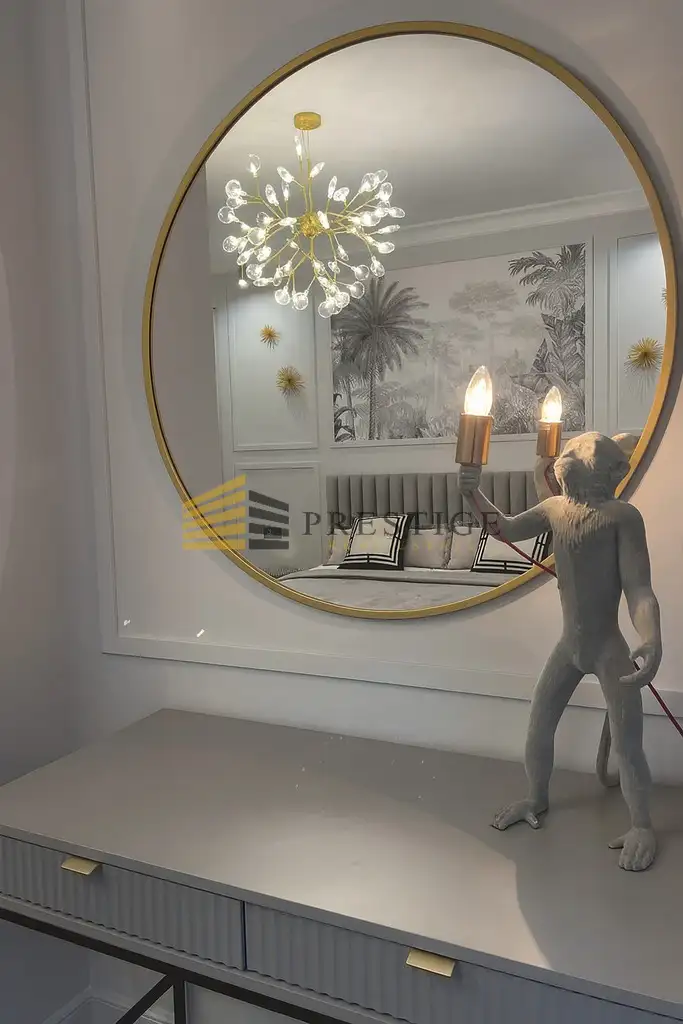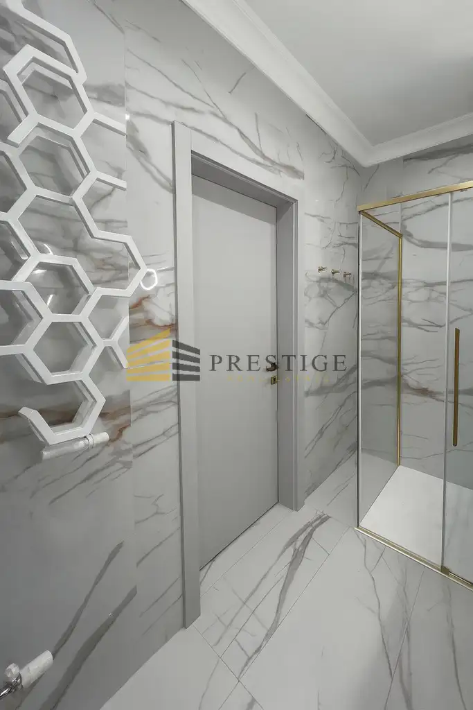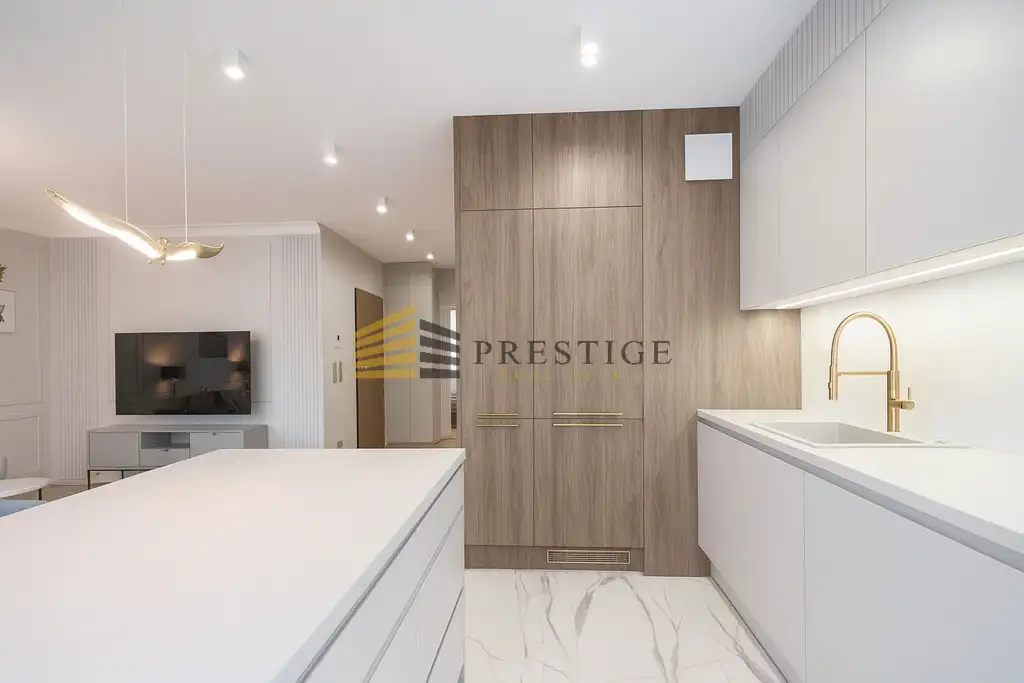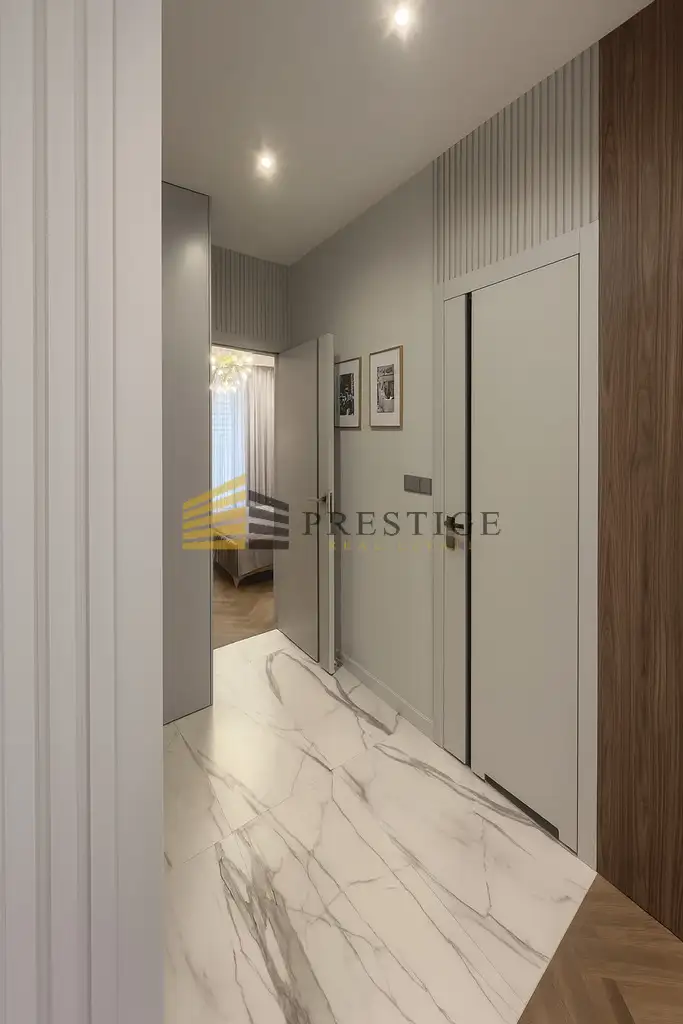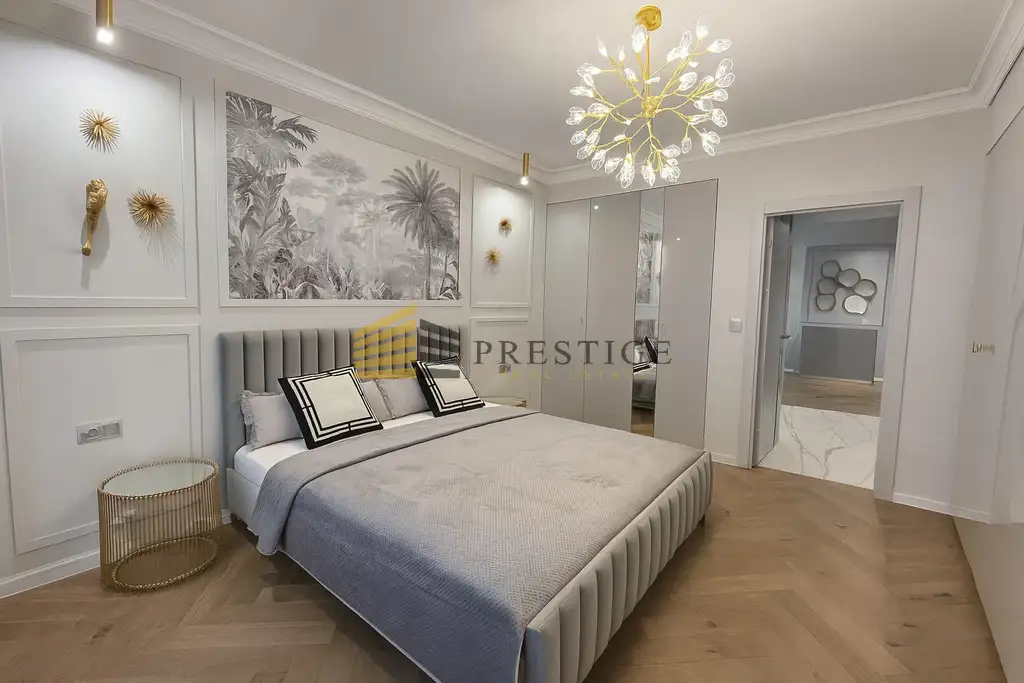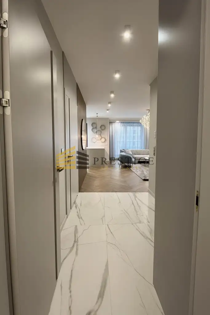 Przestronny salon z designerskim oświetleniem, elegancką sofą i strefą TV, połączony z jadalnią oraz aneksem kuchennym,Nowoczesna kuchnia z zabudową na wymiar, wyspą i wysokiej jakości sprzętem AGD,Sypialnia z dużym łóżkiem, pojemnymi szafami w zabudowie i dekoracyjną tapetą,Łazienka wykończona w marmurze z kabiną prysznicową typu walk-in,Hol wejściowy z dużym lustrem i zabudową garderobianą.Atuty mieszkania:
