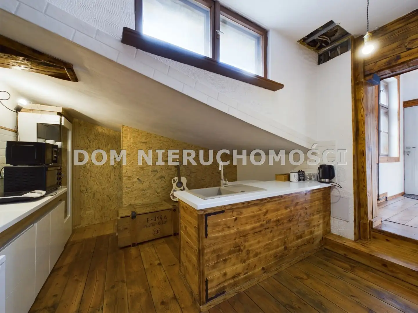 Ciekawie prezentuje się kuchnia, jej niebanalny wystrój na pewno przyciąga uwagę. Kuchnia ma minimalistyczną zabudowę i jest wyposażona w najpotrzebniejsze sprzęty. Jej atutem są okna pod samym sufitem - jest to coś niepowtarzalnego. Z kuchni przechodzi się do pomieszczenia na strychu.